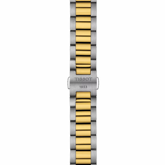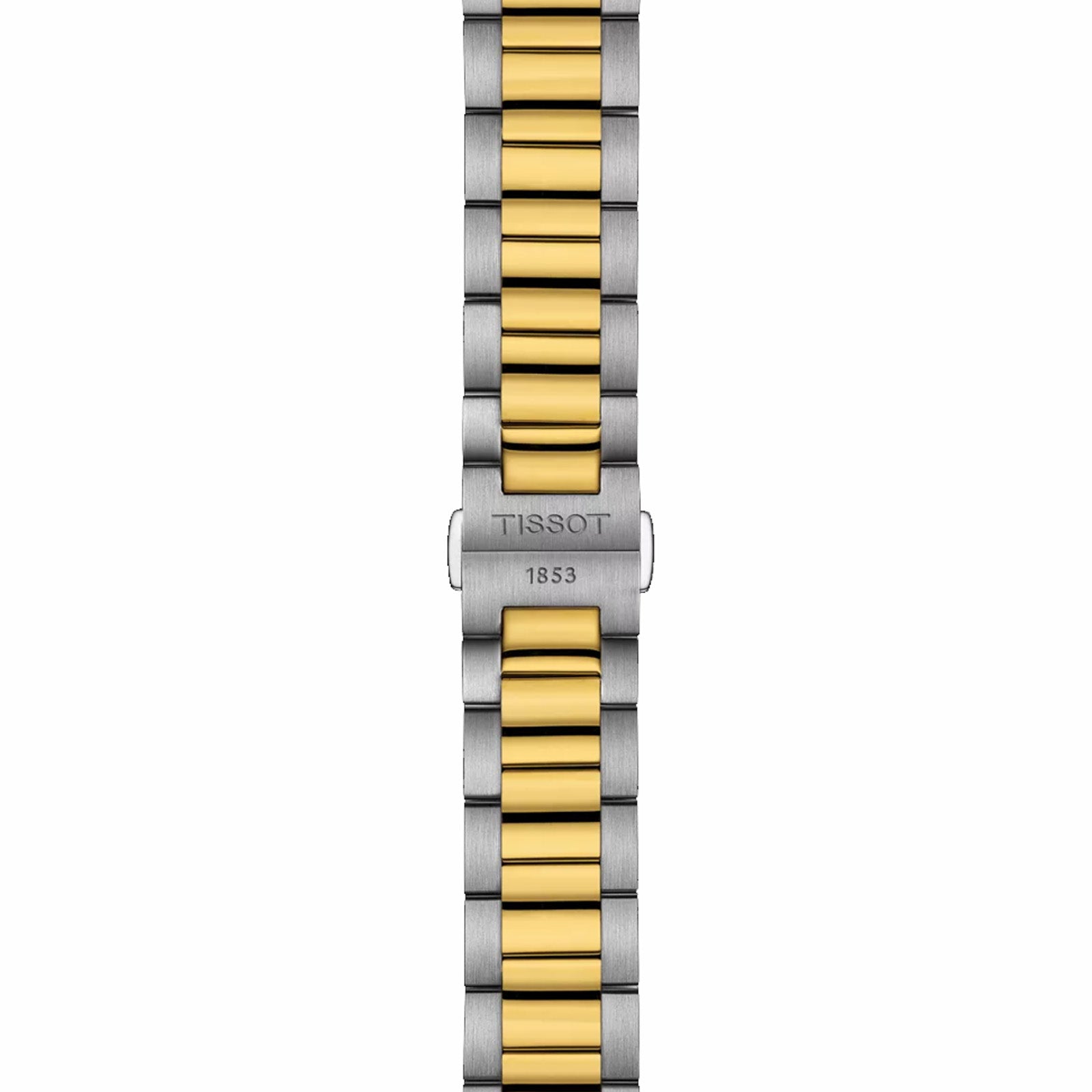 he best-selling Tissot PR 100 remains true to its name: precise (P), robust (R), and water-resistant to a pressure of 10 bar (100 m). Made from stainless steel, this new design offers a large dial thanks to the narrow bezel, for an elegant and minimalist look. The SuperLuminova®-coated hands enable precise reading even in the dark. This Tissot PR 100 Quartz model features a 40mm stainless steel case with a gold PVD bezel, a bright white dial and a classic two-toned stainless-steel and gold PVD strap for a touch of elegance that will make the difference. About the watch SKU T1504102201100 Collection Classic Contemporary Weight (g) 122.00 Warranty 2 Years of Warranty Country of manufacture Switzerland Case & crystal Length (mm) 40.00 Width (mm) 40.00 Thickness (mm) 8.25 Lug width (mm) 20.00 Water resistance Water-resistant up to a pressure of 10 bar (100 m / 330 ft) Case shape Round Case material 316L stainless steel case with yellow gold PVD coating Crystal Scratch-resistant sapphire crystal Movement Energy Quartz EOL Movement Swiss quartz Battery battery type Renata 371 Functions EOL (battery end-of-life indicator) Dial HMSD (Hour, Minute, Second, Date) Caliber 11 1/2''' Diameter (mm) 25,6 Dial Dial colour White Indexes Indexes Luminescent material on the hands Super-LumiNova Strap Strap/Chain reference T605049117 Bracelet coating PVD Strap colour Grey, Yellow Gold 1N14 Buckle Butterfly clasp with push-buttons, Interchangeable quick release bracelet Buckle options Interchangeable quick release bracelet Links reference T613049265