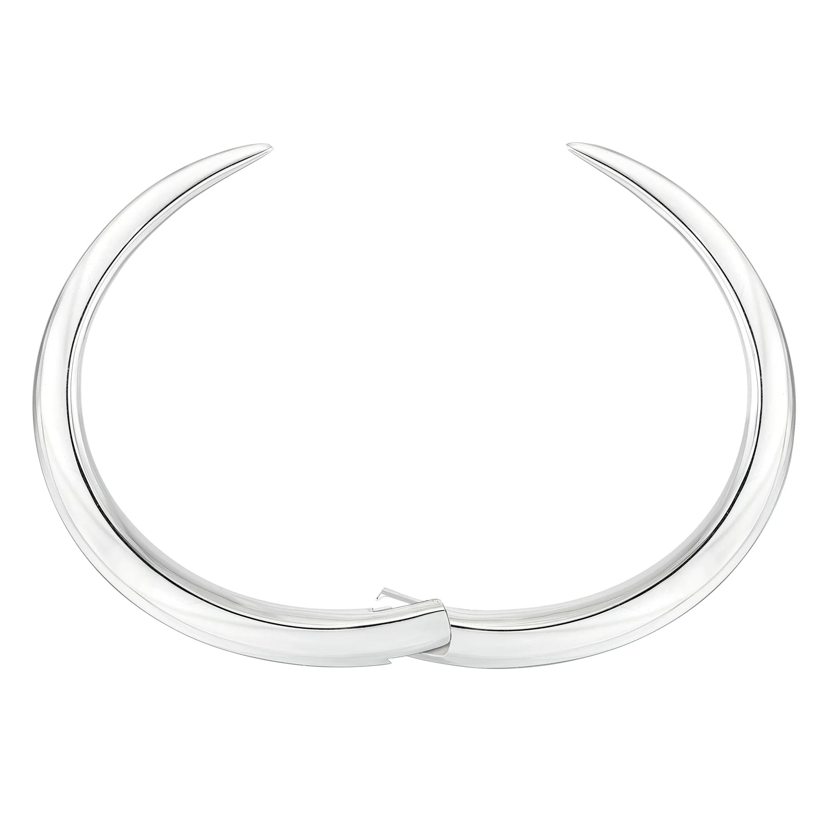 Fluid & Generous Cuff Bangle Sabre Deco Cuff Bangle is handcrafted from sterling silver. Sabre Deco is Sabre's powerful arc emboldened, combining a high contrast of hybrid materials with couture elegance. With rounded, generous proportions and of some heft, an elegant curve of sterling silver encloses the wrist incorporating all of Sabre Deco's signatures; gentle graduations, snaked proportions, hand-grooved ridges and tapering at both ends to a gentle point. A discreet hinge mechanism allows for the cuff to be taken on and off with ease. Sabre Deco pieces are bright, vigorous jewels, combining geometric materials to create simple, precise configurations. Delicate detailing such as hand-carved facades and a 360 degree knife-edge finish are exquisite touches. Our House code, Line, inspires a collection of engineered silhouettes, with sharp lines, architectural blocking, stature and solidity all hallmarks of Shaun Leanes take on modernism for the 21st century. Specification Metals Silver Circumference: 16cm/6.3ins Diameter: 54mm