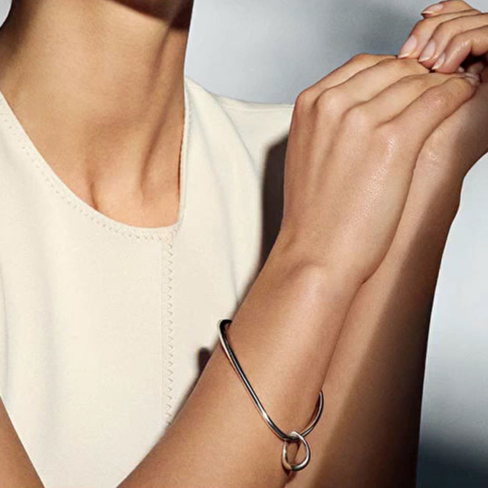 An organically shaped sterling silver bangle wraps elegantly around a wrist with a smaller version attached permanently as a charm. Symbolising the unbreakable links between mother and child or perhaps two lovers or lifelong friends, this bracelet is as meaningful as it is beautiful and so makes the perfect gift for the special woman in your life. Designer Jacqueline Rabun believes that jewellery should have meaning as well as good looks and her highly regarded Offspring collection does exactly that. Inspired by the unique bond between mother and child, the pieces are sophisticated and elegant, but always with true emotional power. The bangle is artfully crafted from sterling silver. M: 195 mm / 7.68 inches