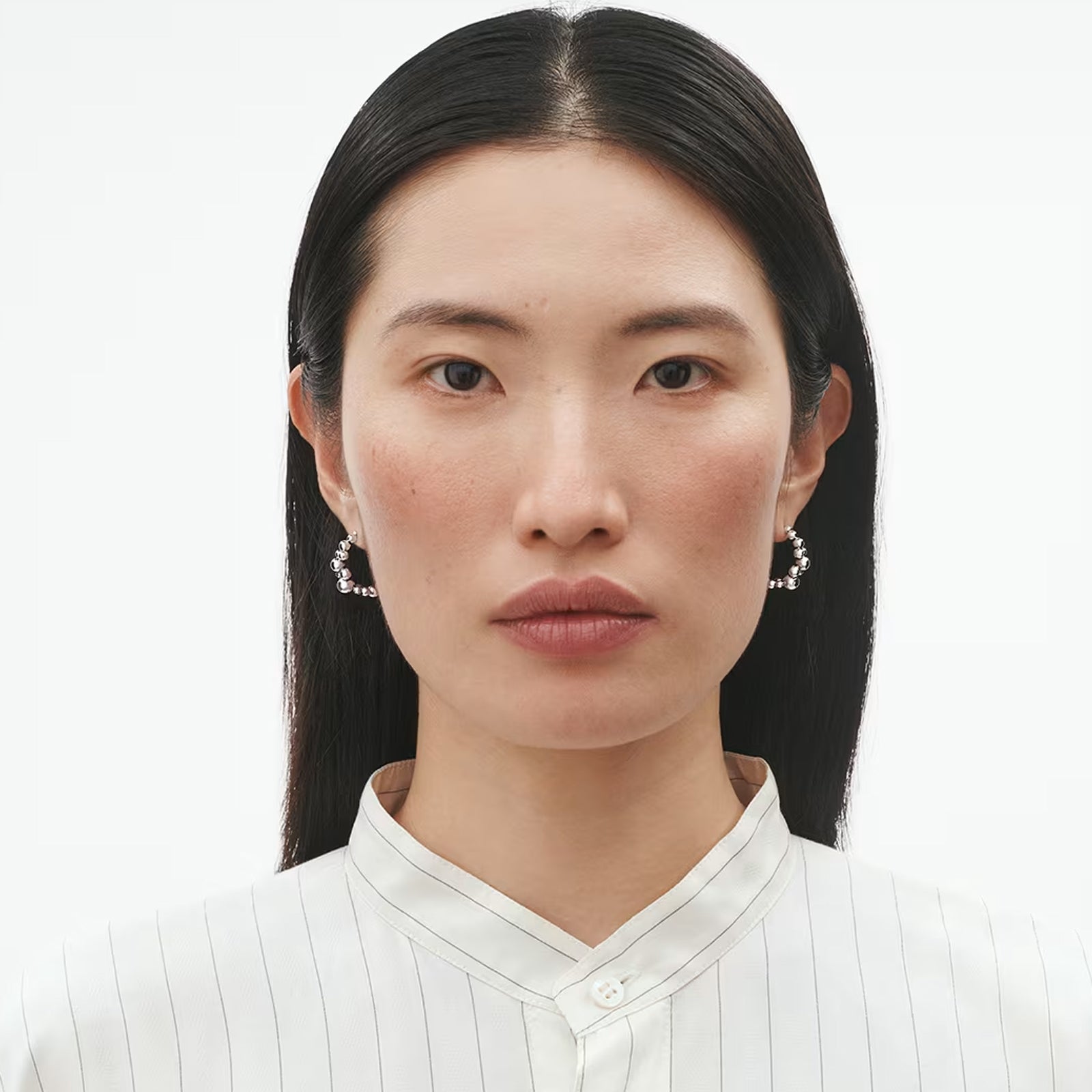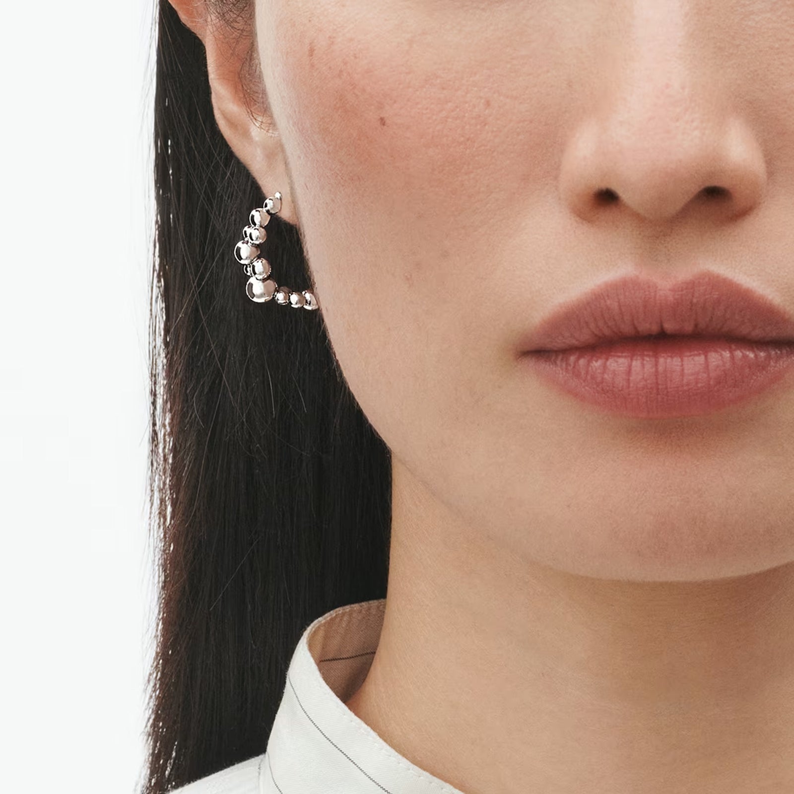 Inspired by nature, the Moonlight Grapes collection is a timeless piece of Scandinavian design that brings sculptural elegance to any outfit and occasion. These simple yet stylish hoops can be worn to dress up an everyday outfit or elevate an elegant ensemble. Their looping form is made up of a chain of sterling silver beads inspired by the grape-shaped motifs that ornamented Georg Jensen’s holloware designs from the early 1900s. Product details Item number: 20001409 Materials: Sterling Silver Measurements H: 23 mm / 0.91 inches. W: 5 mm / 0.2 inches. Design year: 2023