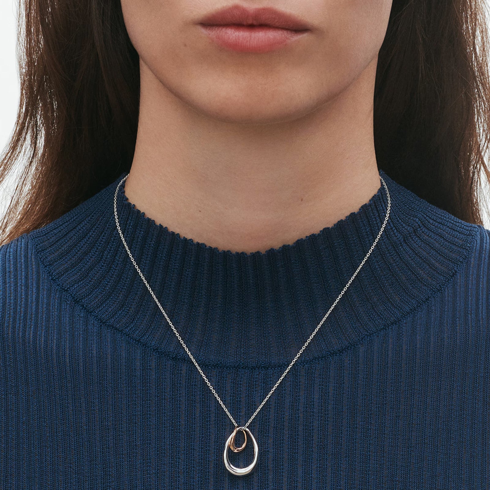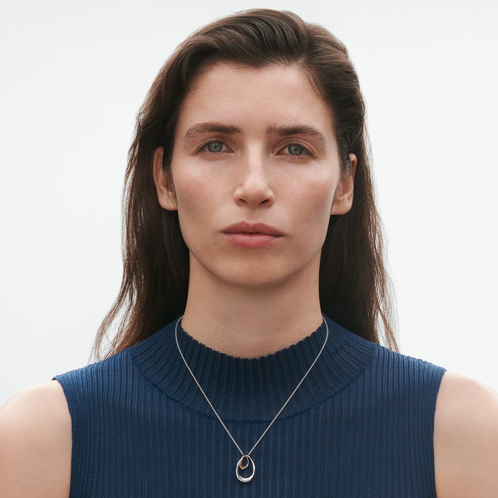 Two irregular organic shapes in silver and gold are interlocked in a form that symbolises the unbreakable bond between parent and child. The Offspring necklace has a strong emotional resonance that adds an extra layer of meaning to the simple minimal beauty of its design. Created for Georg Jensen by Jacqueline Rabun, the Offspring collection is both a masterclass in Scandinavian style but also a shining example of the way that jewellery can take its place in our hearts and lives too. The outer ring of the pendant is made from sterling silver whilst the smaller ring from 18 karat rose gold giving the two pieces their distinct but similar personalities. The rings hang from a fine silver chain that can be adjusted in length. Product details Item number: 10012763 Materials: Sterling Silver, 18 kt. rose gold Measurements: H: 21.8 mm / 0.86 inches. W: 17 mm / 0.67 inches. 45 cm, 1.1 mm anchor chain. The length of the chain can be shortened by using the loops. Launch year: 2001