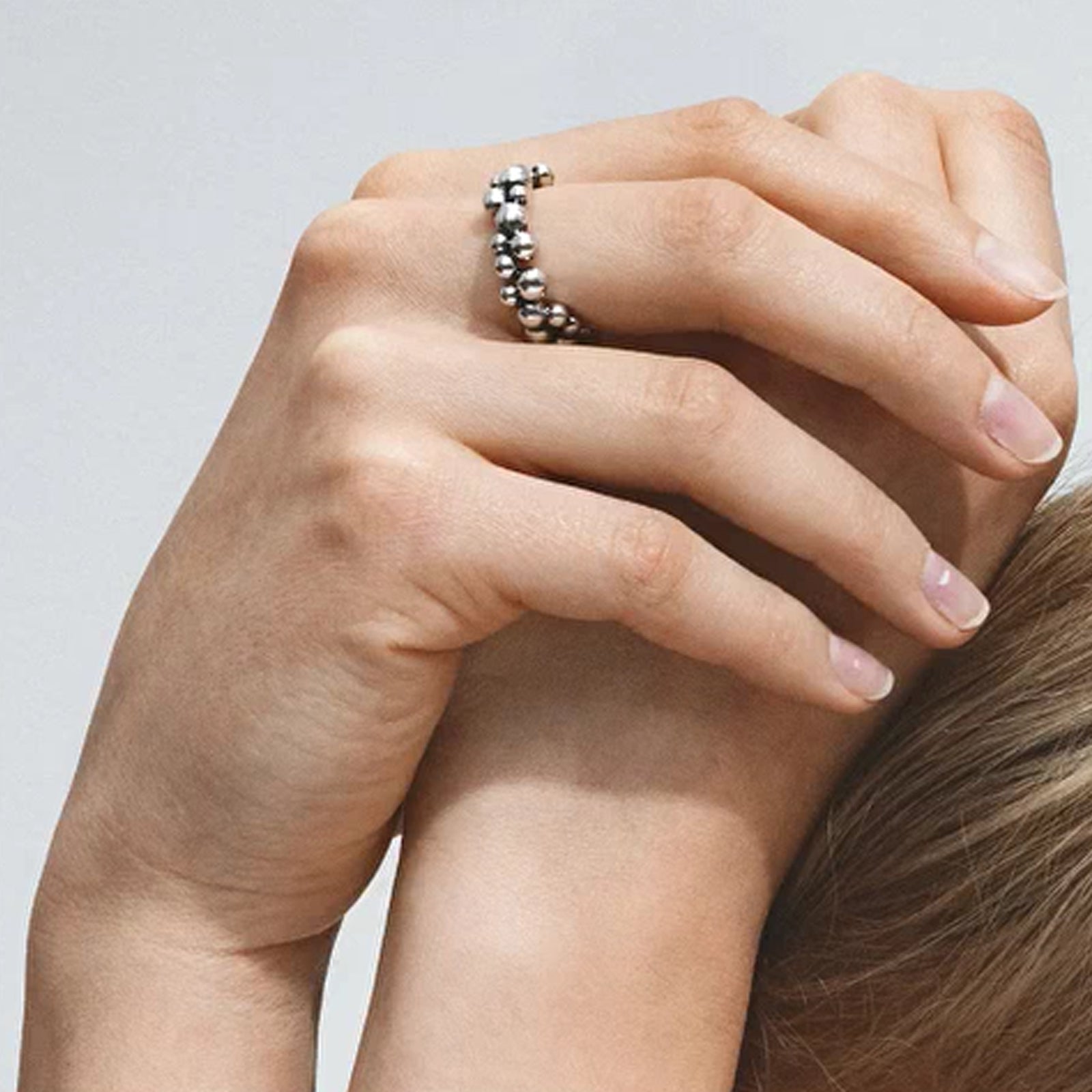 Inspired by nature, the Moonlight Grapes collection is a timeless piece of Scandinavian design that brings sculptural elegance to any outfit and occasion. This playfully formed ring is made up of a simple loop of sterling silver beads, shaped to resemble the grapes that adorned some of Georg Jensen’s holloware designs from the early 1900s. It’s a contemporary take on the iconic motif that adds a dynamic touch to any ensemble. Product details Item number: 20001418 Materials: Sterling Silver Measurements: W: 8 mm / 0.31 inches. Design year: 2023