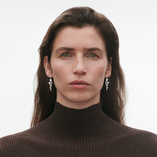 These sterling silver earrings resemble an abstracted bunch of grapes. With an oxidised finish that accentuates their sculptural form, the earrings create a classic set when worn with a matching pendant or necklace from the same collection. Taking a grape detail from an early Georg Jensen silver piece as inspiration, the iconic Moonlight Grapes collection abstracts the shape to create jewellery that acknowledges the highly decorative natural forms of the Art Nouveau period but in a new and graphic way. The earrings are beautifully crafted from sterling silver with an oxidised finish. They are suitable for pierced ears. Product details Item number: 10019037 Materials: Oxidised sterling silver Measurements: H: 36 mm / 1.42 inches. Design year: 2020
