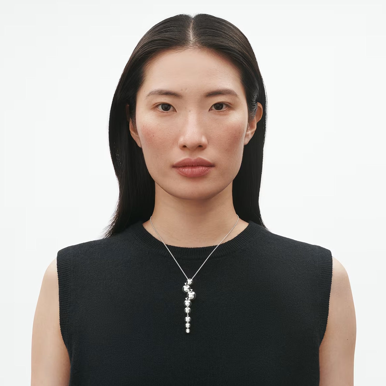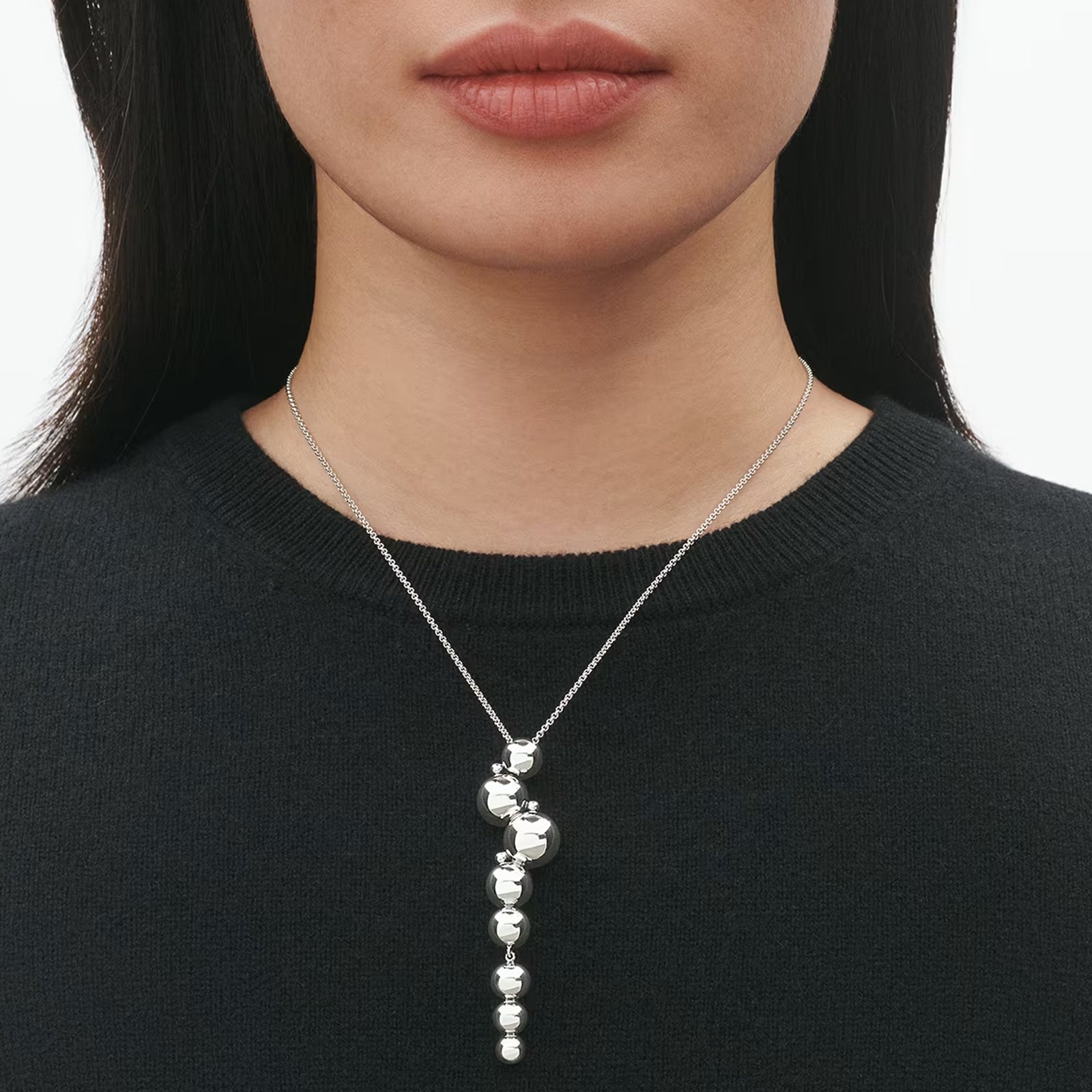 A series of different-sized sterling silver beads tumble down asymmetrically to form an abstracted bunch of grapes in this sculptural pendant. The pendant looks particularly elegant when worn as a set with the matching earrings. The Moonlight Grapes collection takes a decorative motif of grapes from a piece of silverware designed by Georg Jensen himself and reinventing it into a new, sculptural form, the Moonlight Grapes collection creates something that is both contemporary and stylish. The pendant is beautifully crafted from sterling silver with an oxidised finish. It is suspended from a 45 cm pea chain that can be shortened 2 or 4 cm for the perfect fit. Product details Item number: 20000661 Materials: Oxidised sterling silver Measurements: H: 70 mm / 2.76 inches. 45 cm, 1.5 mm pea chain. The length of the chain can be shortened by using the loops. Design year: 2020