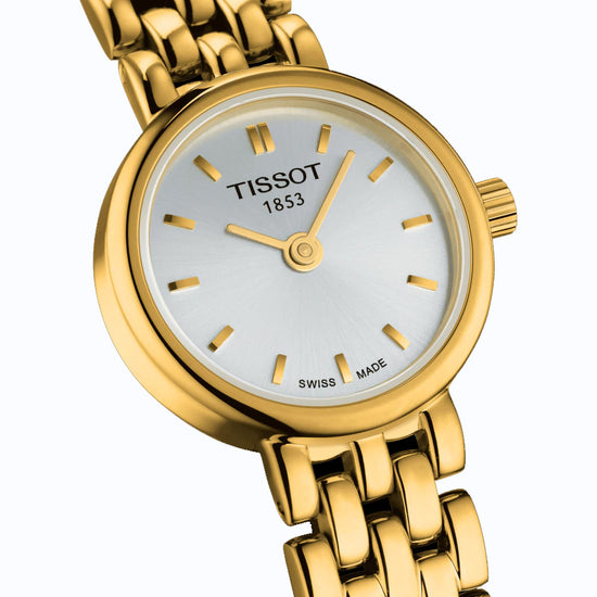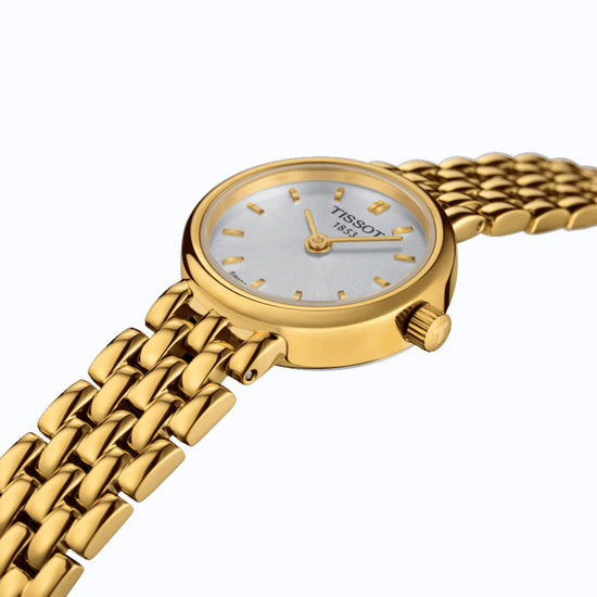 Tissot Lovely T058.009.33.031.00. Round silver colour dial with baton markers. 19.5mm PVD gold plated stainless steel case and bracelet. Sapphire crystal glass and 30m water resistant. This stunning piece conveys the very essence of class with its discrete yet absolutely gorgeous mini-size and feminine round case. These carry their name well as they are truly lovely timepieces with completely irresistible charm. Discover this lovely version with its white dial and golden stainless steel bracelet, for a chic and elevated look.