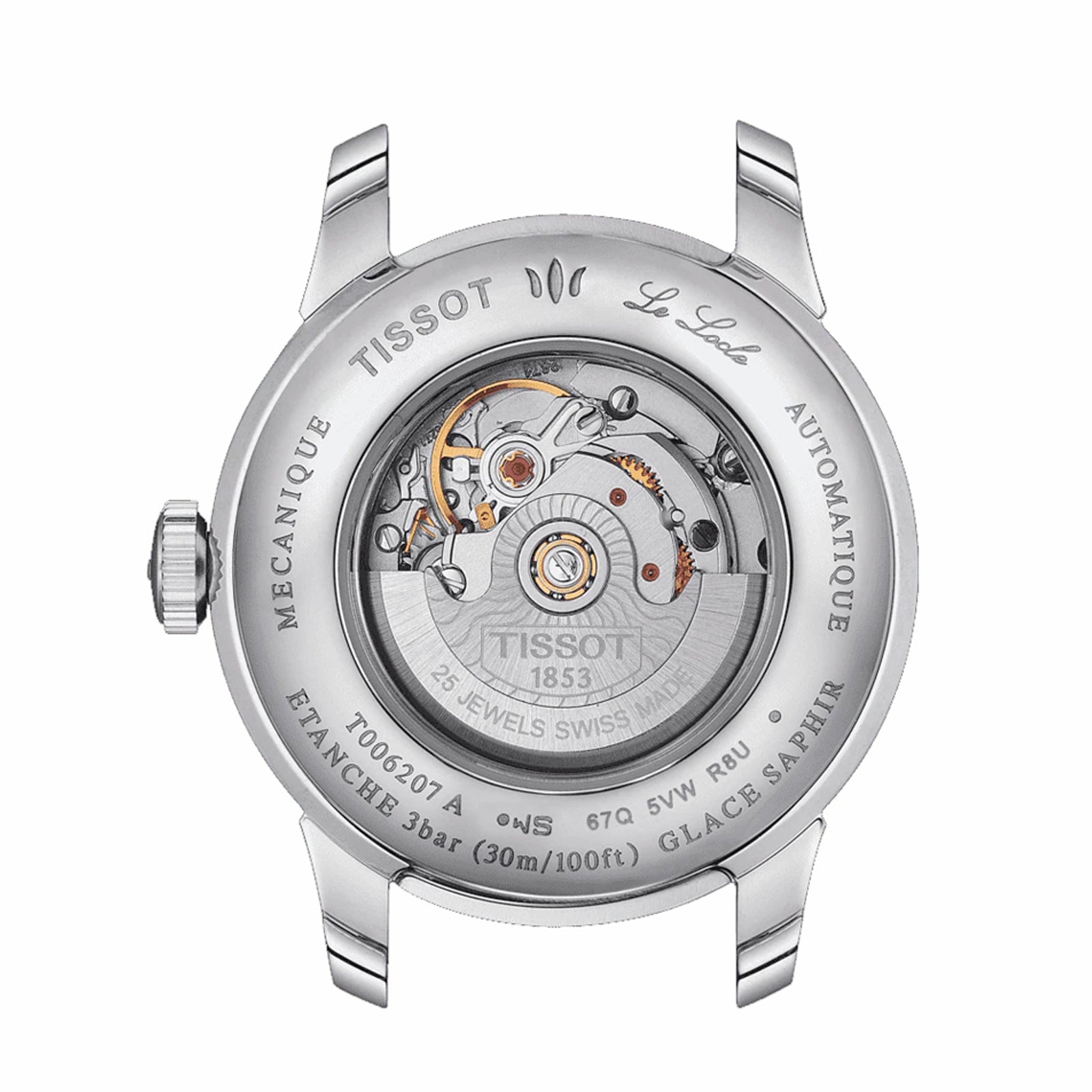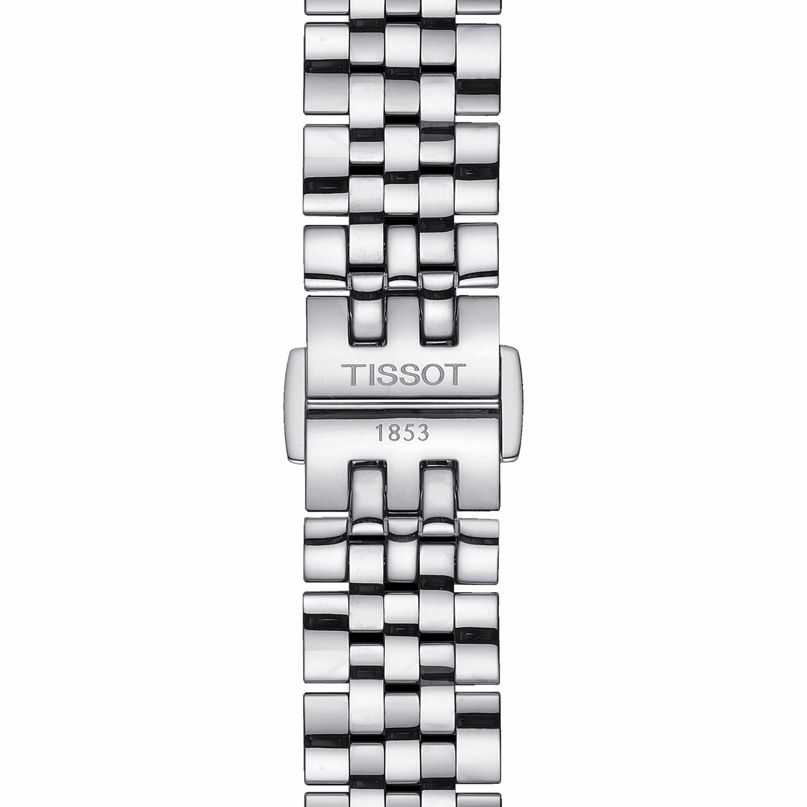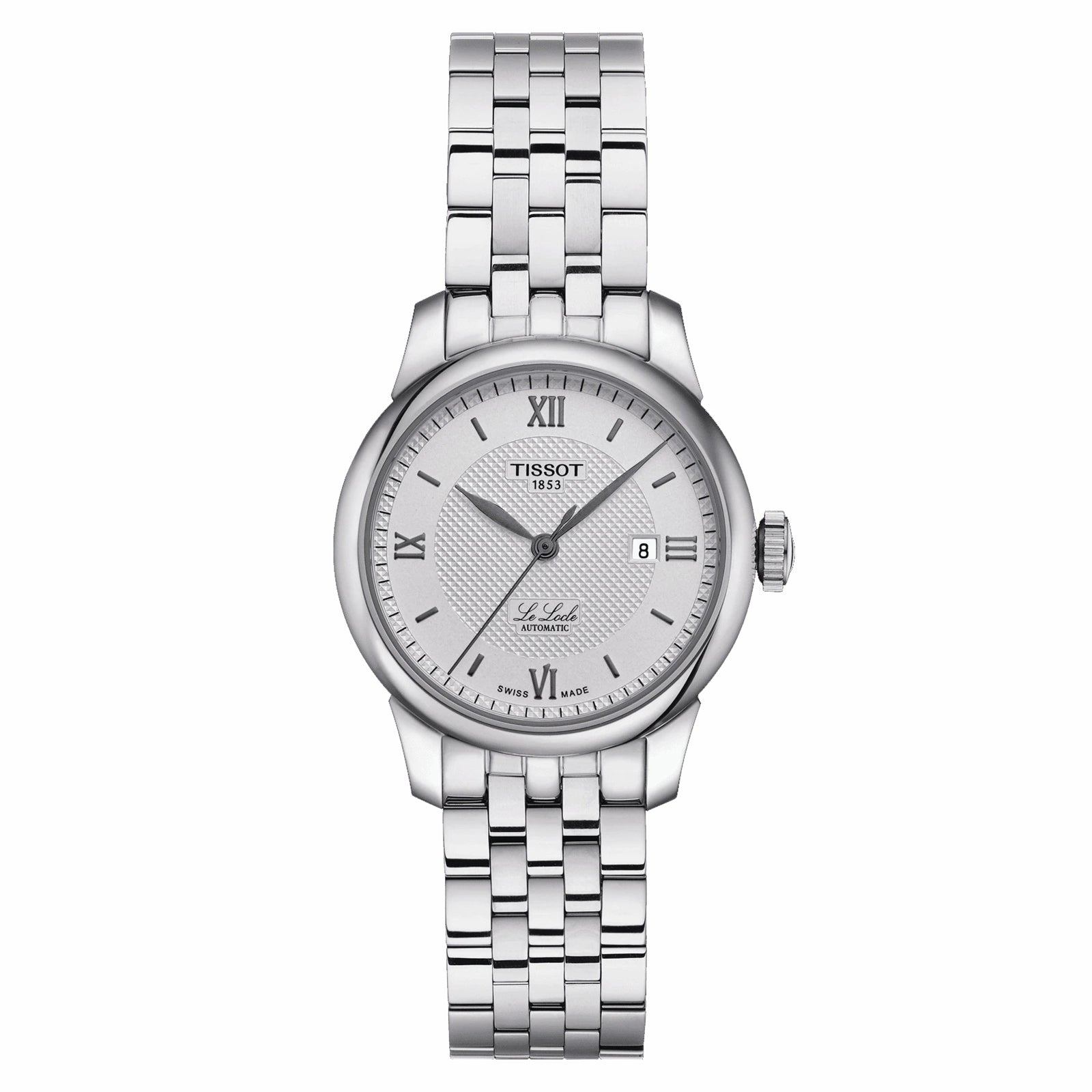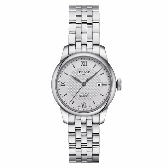 Named after Tissot's hometown and created to celebrate its 150th anniversary, the Le Locle line perfectly embodies the DNA and craftsmanship values of the brand. Powered by an automatic Swiss movement, the Le Locle Automatic Lady features beautiful Roman numerals and the traditional Le Locle signature. Discover this model with its stainless steel bracelet and matching dial for a chic and elegant look. SWISS MADE Gender Ladies -  Warranty 2 Years of Warranty  - Water-resistant up to a pressure of 3 bar (30 m / 100 ft) - Weight 77 - Collection T-Classic - SKU T0062071103800 - Case shape ROUND - Lugs 14.00 - Case Material 316L stainless steel case - Crystal Scratch-resistant sapphire crystal - Width 29.00 - Length 29.00 - Case options see-through case back - Thickness 9 - Dial HMSD - Power reserve power reserve of 38 hours - Diameter (mm) 17,2 - Jewels 25 Caliber 7 3/4''' Movement.