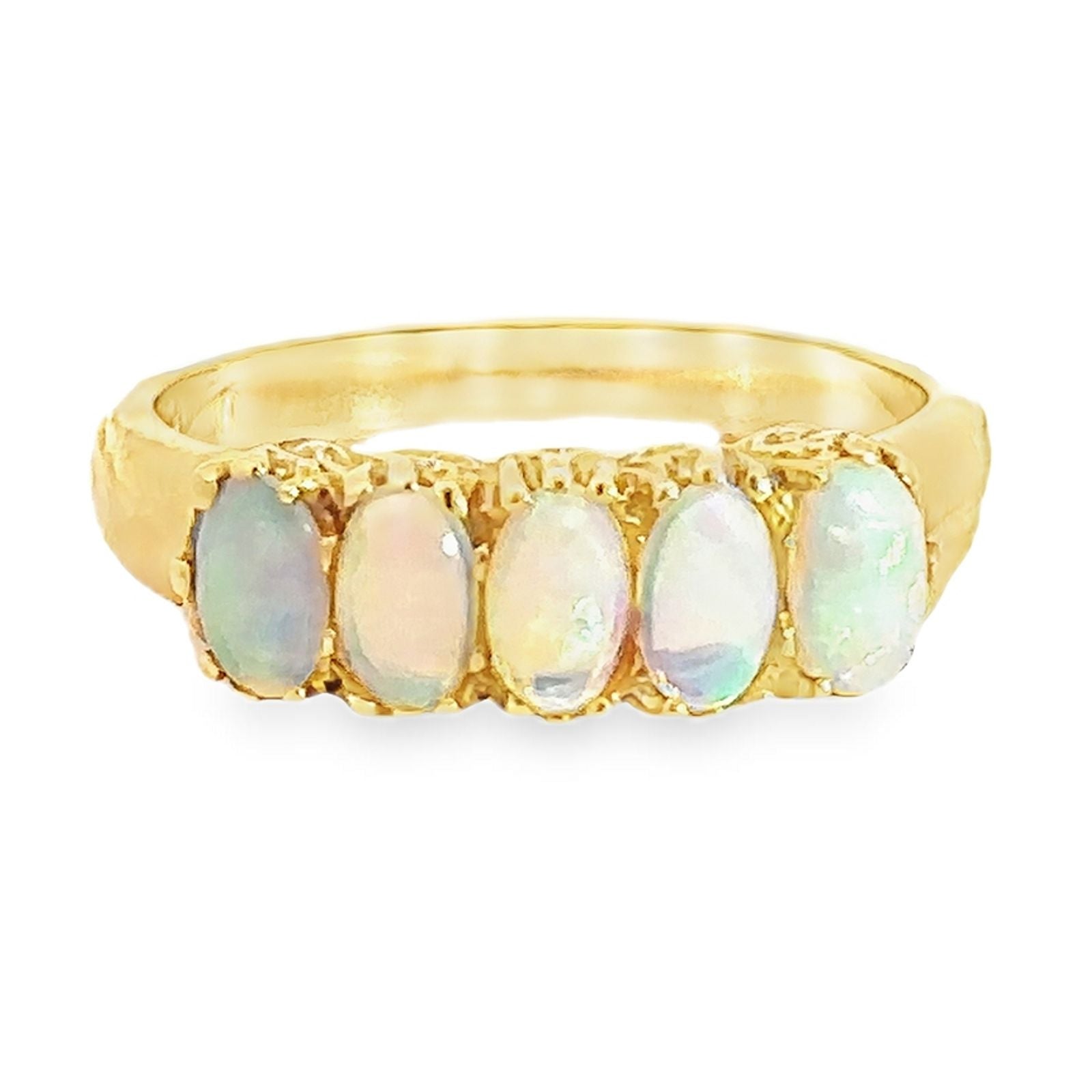 18ct yellow gold ring featuring five stunning oval claw set opals totalling 0.74ct. The opals display a magical play of colours such as pink, green, blue and yellow.