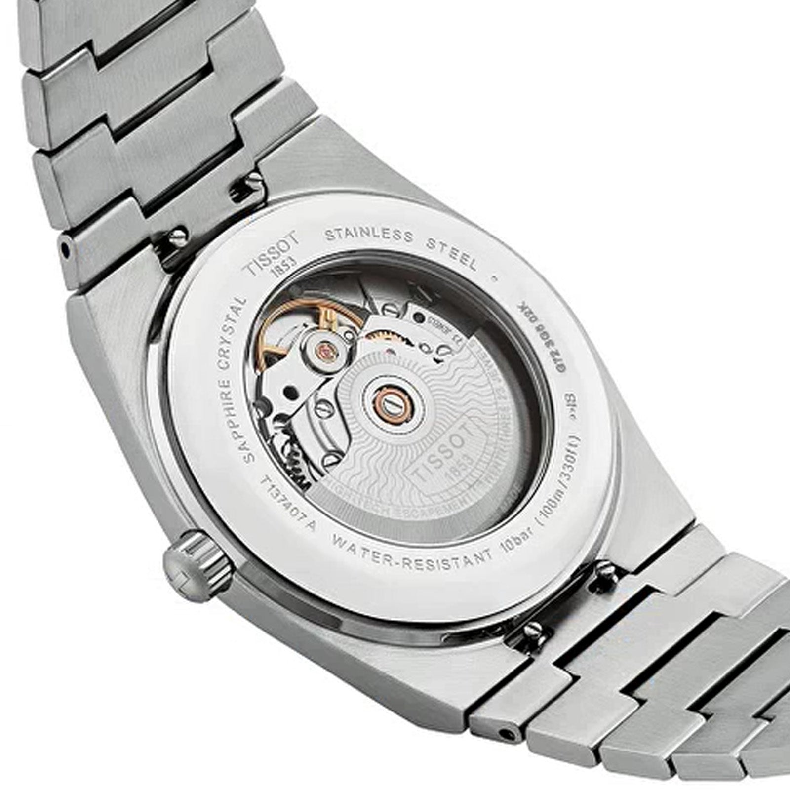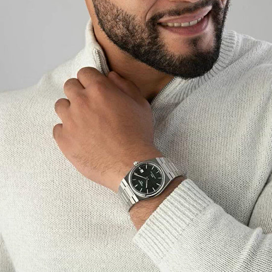 If you are looking for a slim, smooth watch with an authentic ‘70s feel, look no further than the PRX Powermatic 80. Created for those with an eye for design and packed with twenty-first century features in a Tissot case shape from 1978, the PRX is a must-have on every watch fan’s wish list. The self-winding Powermatic 80 movement delivers reliability and precision thanks to the innovative Nivachron hairspring. With 80 hours of power reserve, it’s a modern movement designed to keep pace with busy lifestyles. Discover this 40mm version with its dark green honeycomb dial and stainless steel bracelet, for a trendy yet classy look. SKU T1374071109100 Collection Classic Contemporary Weight (g) 138.00 Warranty 2 Years of Warranty Country of manufacture Switzerland Length (mm) 39.50 Width (mm) 40.00 Thickness (mm) 10.93 Lug width (mm) 12.00 Water resistance Water-resistant up to a pressure of 10 bar (100 m / 330 ft) Case shape Tonneau shape Case material 316L stainless steel case Case options See-through caseback Crystal Scratch-resistant sapphire crystal with antireflective coating Energy Automatic Movement Swiss automatic Power reserve Power reserve up to 80 hours Functions Patented Nivachron balance spring Dial HMSD (Hour, Minute, Second, Date) Caliber 11 1/2''' Diameter (mm) 25,6 Dial colour Green Indexes Indexes Luminescent material on the hands Super-LumiNova Strap/Chain reference T605046447 Strap colour Grey Buckle Butterfly clasp with push-buttons, Interchangeable quick release bracelet Buckle options Interchangeable quick release bracelet Links reference T613046518
