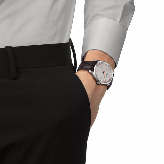 The best-selling Tissot PR 100 remains true to its name: precise (P), robust (R), and water-resistant to a pressure of 10 bar (100 m). Made from stainless steel, this new design offers a large dial thanks to the narrow bezel, for an elegant and minimalist look. The SuperLuminov coated hands enable precise reading even in the dark. This Tissot PR 100 Quartz model features a 40mm stainless steel case, a silver brushed dial and a contrasting brown leather strap for a touch of elegance that will make the difference. About the watch SKU T1504101603100 Collection Classic Contemporary Weight (g) 57.00 Warranty 2 Years of Warranty Country of manufacture Switzerland Case & crystal Length (mm) 40.00 Width (mm) 40.00 Thickness (mm) 8.25 Lug width (mm) 20.00 Water resistance Water-resistant up to a pressure of 10 bar (100 m / 330 ft) Case shape Round Case material 316L stainless steel case Crystal Scratch-resistant sapphire crystal Movement Energy Quartz EOL Movement Swiss quartz Battery battery type Renata 371 Functions EOL (battery end-of-life indicator) Dial HMSD (Hour, Minute, Second, Date) Caliber 11 1/2''' Diameter (mm) 25,6 Dial Dial colour Silver Indexes Indexes Luminescent material on the hands Super-LumiNova  Strap Strap/Chain reference T600049155 Strap length 6h (mm) 120.00 Strap length 12h (mm) 75.00 Strap front Alligator-style grained cowhide Strap back Synthetic Strap colour Brown Buckle Standard buckle, Interchangeable quick release bracelet Buckle options Interchangeable quick release bracelet