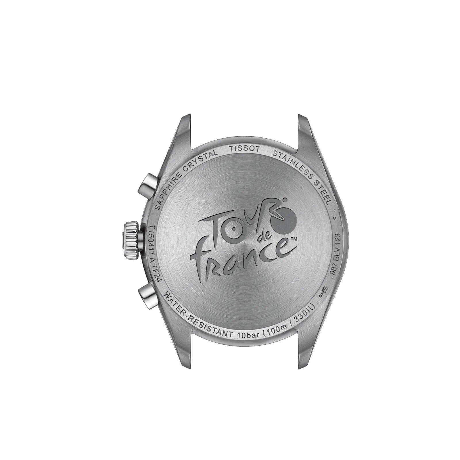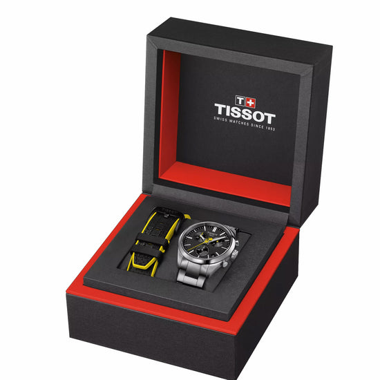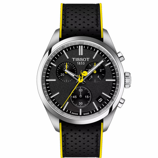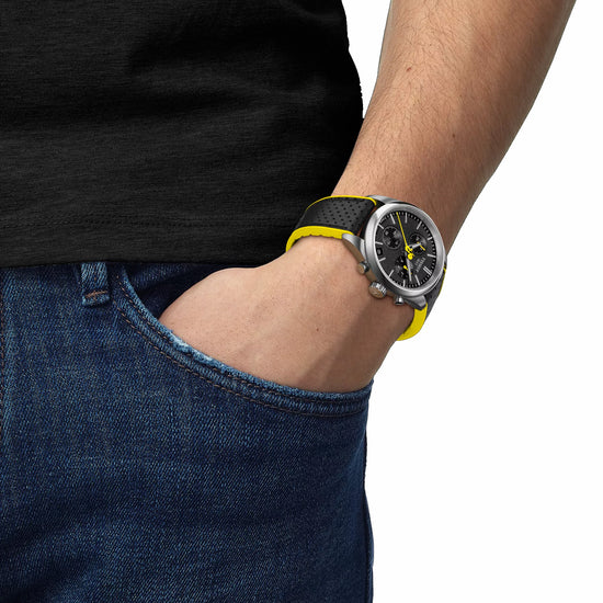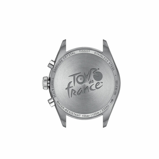 Tour de France takes over our PR 100 Chronograph collection! With its asphalt-grained black dial inspired by the road, and a bicycle-shaped second hand featuring the iconic yellow colour of the competition, this beautiful timepiece is the perfect accessory for cycling aficionados. The black disc of the date window adds a sleek touch, aligning with the overall aesthetic of the watch. The G10.212 chrono quartz movement provides precision and robustness, complemented by water resistance up to 10 bar (100 meters/330 feet), and visibility in low-light conditions guaranteed by the Super-LumiNova® coating on the needle-shaped hands. The case back of this model is engraved with the iconic logo of the Tour de France. Durable and versatile, this PR 100 Chronograph comes with a three-row metal bracelet with a butterfly buckle as well as an additional black bi-material strap inspired by the bicycle handlebar grips. About the watch SKU T1504171105100 Collection Classic ContemporaryWeight (g) 135.00 Warranty 2 Years of Warranty Country of manufacture Switzerland Case & crystal Length (mm) 40.00 Width (mm) 40.00 Thickness (mm) 11.26 Lug width (mm) 20.00 Water resistance Water-resistant up to a pressure of 10 bar (100 m / 330 ft)Case shape Round Case material 316L stainless steel case Case options Engraved caseback Crystal Scratch-resistant sapphire crystal Movement Energy Quartz EOL Movement Swiss quartz Battery battery type Renata 394 Functions EOL (battery end-of-life indicator), 30-minutes and 1/10 of a second counters, Central 60-seconds chronograph hand, ADD and SPLIT functions Dial HMsSD (Hour, Minute, small second, central 60-Seconds hand, Date) Caliber 13 1/4''' Diameter (mm) 29,8 Dial Dial colour Black Indexes Indexes Luminescent material on the hands Super-LumiNova Strap Strap/Chain reference T605049796 Strap colour Grey Buckle Butterfly clasp with push-buttons, Standard buckle, Interchangeable quick release bracelet Buckle options Interchangeable quick release bracelet Links reference T613049824