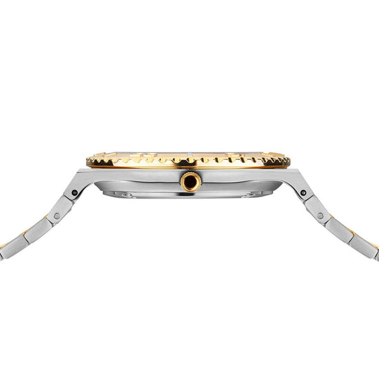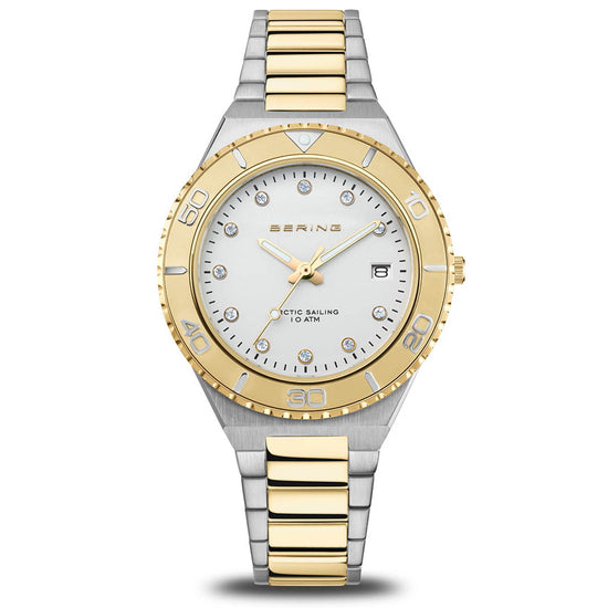 This ladies model from the BERING Classic Collection combines the clear design language of Scandinavia with the radiant allure of gold and silver. The white dial with sparkling crystal indices appears as a calm canvas, brought to life by the finely crafted gold-coloured stainless steel bezel and harmoniously matched hands. A discreet date display at three o’clock highlights its functionality. The oval 36 mm case in polished and brushed stainless steel unites cool silver with warm golden tones and flows seamlessly into the elegant bi-colour stainless steel bracelet. With a fold-over clasp, it sits securely and comfortably on the wrist – a timepiece that is both classic and contemporary. Flat sapphire crystal provides lasting protection for the dial, while the precise quartz movement inside ensures accurate timekeeping. With a water resistance of 10 ATM, this watch is perfectly suited not only to everyday wear but also to sporting activities and contact with water. Collection: Classic Product type: watch Gender: female Glass type: flat sapphire crystal Movement type: quartz Case colour: polished/brushed silver/gold Case material: stainless steel Case length: 43mm Case height: 8mm Case width: 36mm Case diameter: 36mm Case type: oval Strap colour: silver Strap material: stainless steel strap with stainlees steel links Strap length: 145mm Strap width: 18mm Clasp: folding clasp Link material: stainless steel Dial colour: white Water proofness: 10 ATM