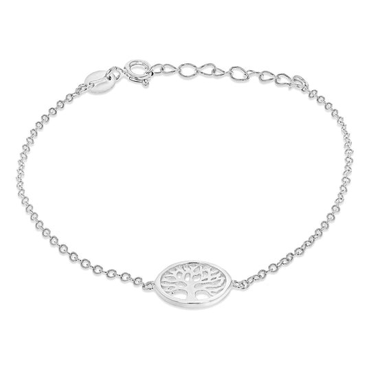 Silver and rhodium coated bracelet tree of life cut out disc on trace chain with extender. 6.25 - 7.25in. The bracelet is rhodium plated to prevent tarnishing.