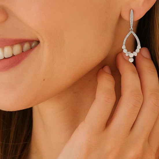 18ct white gold stunning statement diamond set tear drop shape drop earrings. The earrings are set with multi sized round brilliant cut diamonds totalling 1.01ct in H colour SI clarity quality, and secured in an 18ct white gold claw setting. The earrings are fitted with post & scroll backs. Weight - 6.0g. Height - 34.0mm. Width - 12.0mm