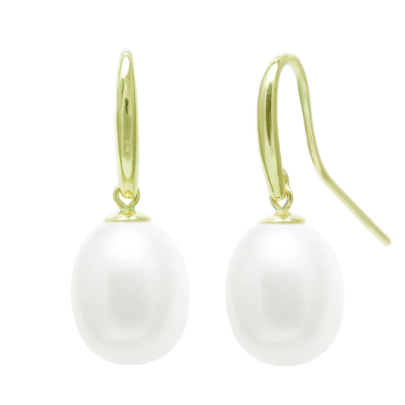 9ct yellow gold 9-10mm white cultured river pearl drop earring with shepherd hook fittings.