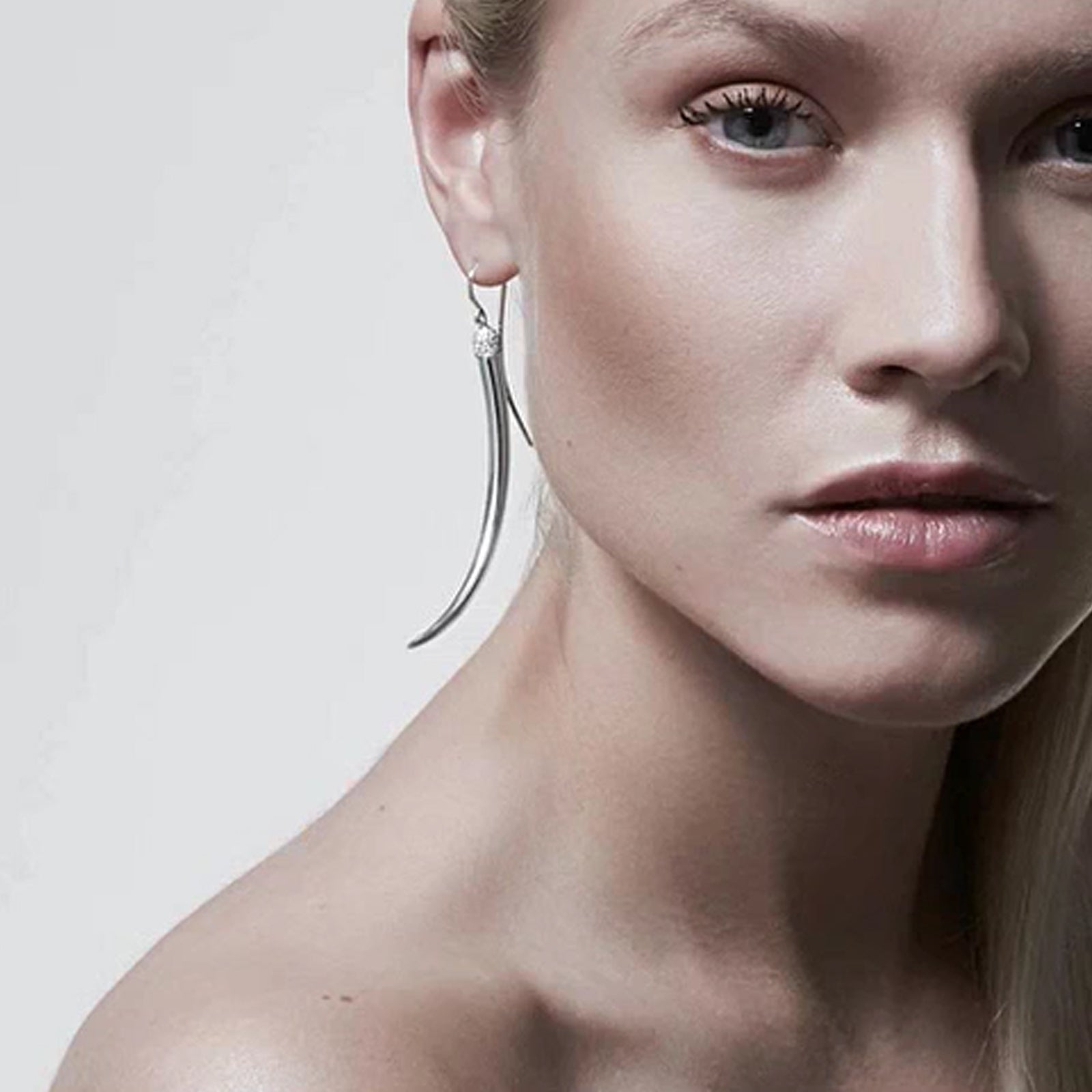 Bold & Iconic Drop Earrings. Iconic, the No.1 long earring is the first piece Shaun created for McQueen?ús show ?ÁThe Hunger?ú. From the catwalk to the wearer, reimagined as a diamond earring, a signature curve that frames the face of a daring icon. Crafted in sterling silver, featuring a bold shepherd's hook fastening and a pave diamond touch, an ultimate couture silhouette.