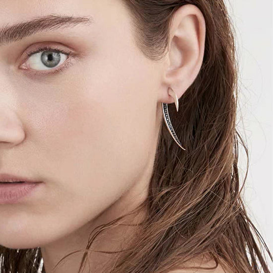 Striking & Elegant Hook Earrings. Hook Size 1 Earrings are handcrafted from sterling silver and black spinel, with a subtle 39mm drop. Black spinel gemstones are selected for their rarity and their opaque, jet-black brilliant sparkle. Sterling silver curves arch around the lobe, gently tapered, graduating to a sharp point. Sweeping the inside, graduated black spinel stones of superior quality, ascending in size, a rush of resplendent monochrome running the entire length of the silhouette. The knife-edge is key, creating facets on the jewel?ús surface, suspending larger gemstones than a conventional silhouette. Hook?ús innovative design is a two-piece construction, seamlessly fitting together front to back, creating a refined shape around the ear, securely fastened in place. A smart alternative to silver drop earrings, black spinel gemstones add drama that will take you through to evening.