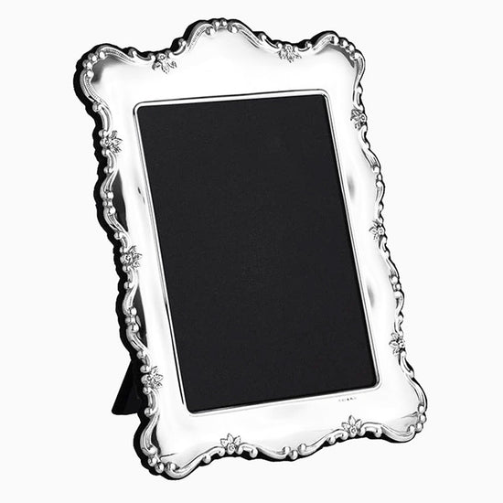 Showcase your favourite photographs with this sterling silver decorative floral edge photo frame with a grey velvet back. Portrait style frames can only be engraved in portrait orientation. All Carrs sterling silver frames bear a British Hallmark. This guarantees it has been independently tested by the Sheffield Assay office.