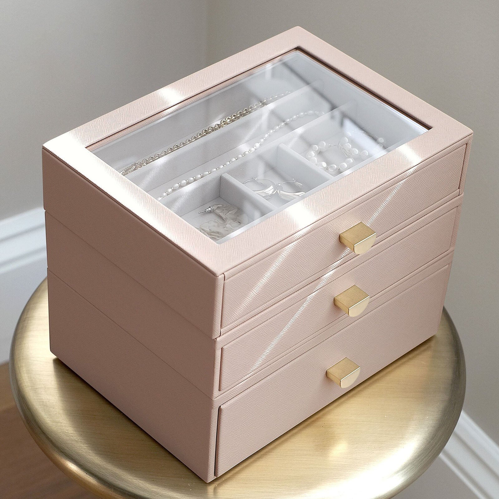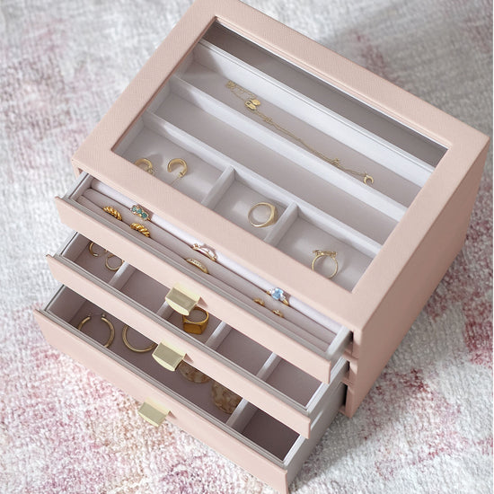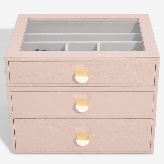 Blush Classic 3 Draw Jewellery Box There'll be no excuse for your favourite jewellery to be anything other than tangle-free and organised! The Blush Pink Classic Display Jewellery Box Set of 3 is perfect for almost every jewellery collection. With plenty of space to keep your necklaces, rings, earrings, watches and more, beautifully organised and safe. The classic set of 3 is the ideal starting point and includes the Classic Jewellery Drawer Lid, the Trinket Drawer and the Deep Accessories Drawer. Product Code: 75887 Material: Faux Leather, Velvet & Glass Size: Medium (Classic) Lining: Grey Velvet Hardware Colour: Gold Dimensions Width: 25cms/9.8inches Height: 19.4cms/7.6inches Depth: 18cms/7.1inches