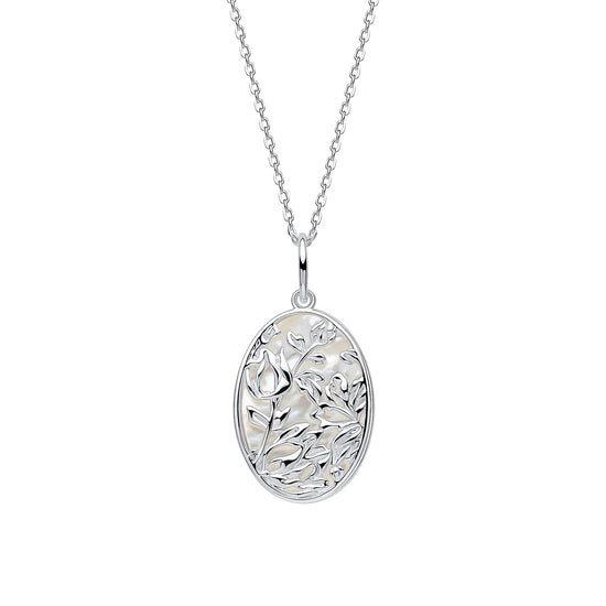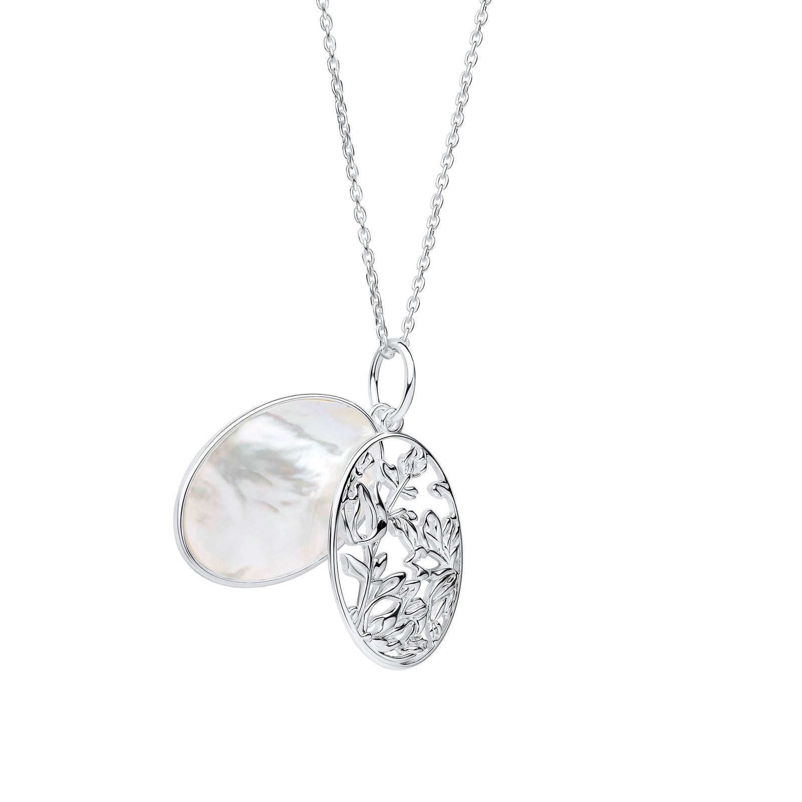 Inspired by the cherished Laura Ashley Lambton Garden print, this elegant necklace captures the gentle romance of an English country garden in full bloom. Crafted in recycled sterling silver, the open floral front, featuring delicate motifs reminiscent of roses, tulips and winding stems, sits gracefully over softly iridescent mother of pearl, creating a layered design that shimmers with movement and light. This necklace is a graceful finishing touch to any outfit, perfect for adding a little moment of beauty to your everyday or bringing a soft, romantic feel to a special occasion. Chain Length:  40-45cm. Dimensions (WxHxD):  15.81 x 30.45 x 2.88mm