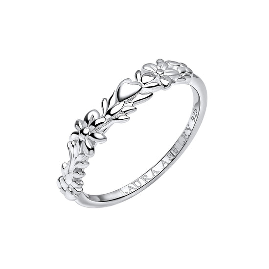 Beautifully crafted from recycled sterling silver, this charming floral ring is inspired by Laura Ashley’s Naunton Folly print. A bespoke painted piece drawn from the rich heritage of the Laura Ashley archive; it combines elements from various prints to create an inviting British stately home garden scene. Delicate flowers on this ring wrap around the finger like a garland, mirroring the intricate floral archways and scattered garden blooms featured throughout the print. Perfect for adding a feminine touch to any outfit. Dimensions (WxHxD): 18.61 x 5 x 2 mm. Size 50.