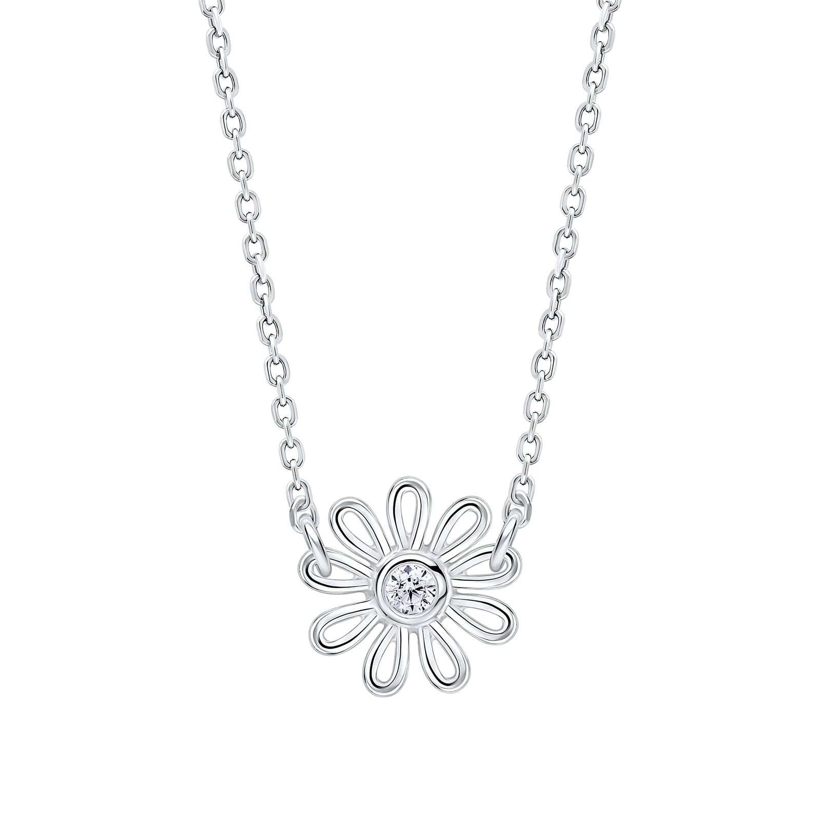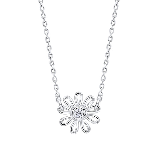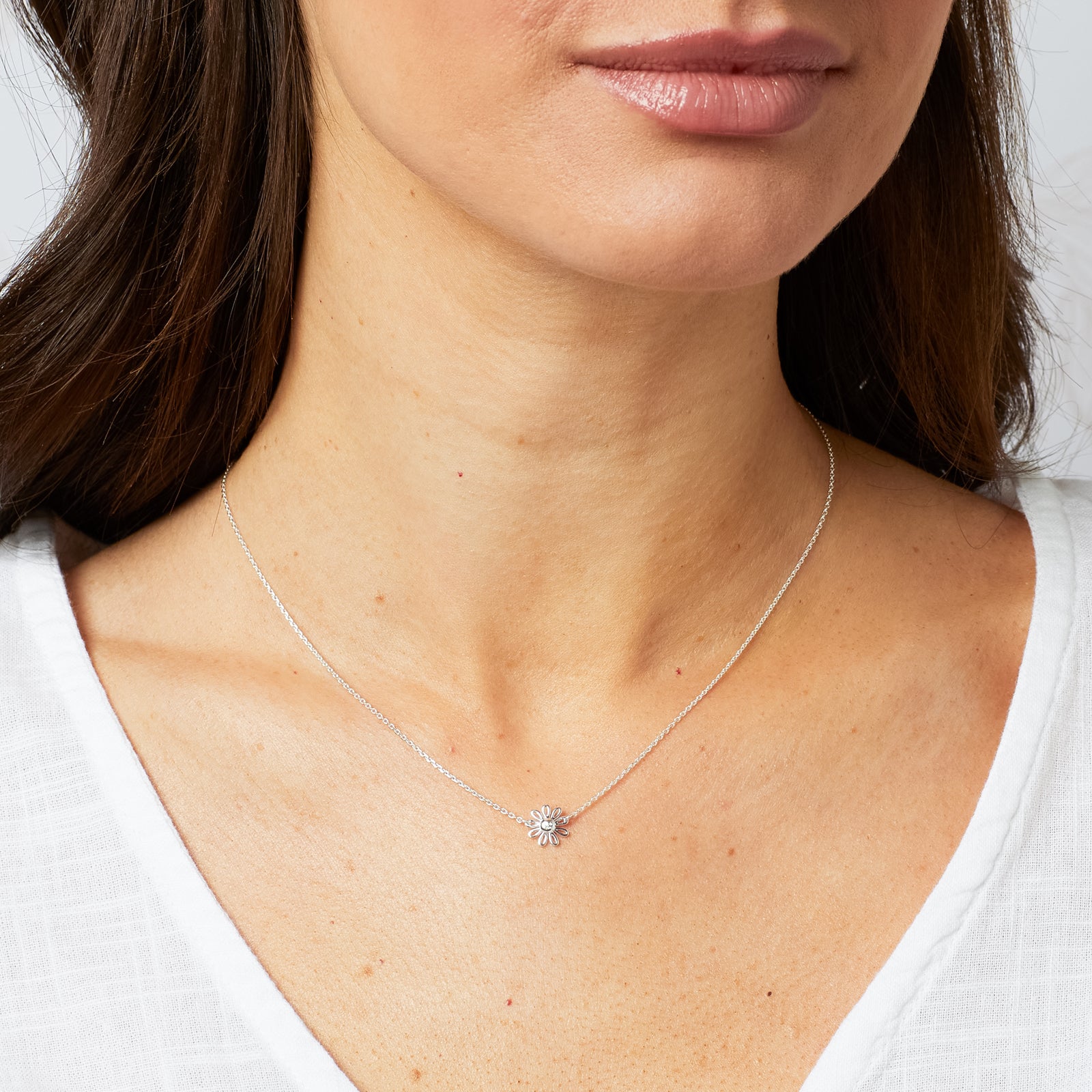 Inspired by the delicate charm of Laura Ashley’s Thorncliff Daisy print, this playful necklace beautifully reflects the print’s stylised daisy design. Crafted from recycled sterling silver, it features a dainty daisy set with shimmering cubic zirconia, the graceful silhouette echoing the timeless floral motifs of the original pattern. Feminine and effortlessly romantic, this necklace lends a timeless floral elegance to your look. Length: 40-45cm. Dimensions (WxHxD): 9 x 9 x 2.1 mm