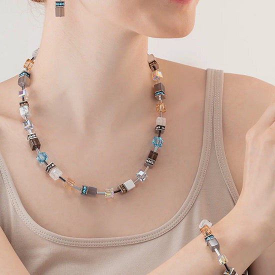 Coeur De Lion GeoCUBE Iconic Statement Precious necklace aqua-beige 4505/10-2010. An arrangement of natural stones including agate, rock crystal and smoky quartz twinned with sparkling crystals for a splash of colour make this GeoCUBE design so special. Stainless steel. Length: 50 cm + 6 cm extension chain