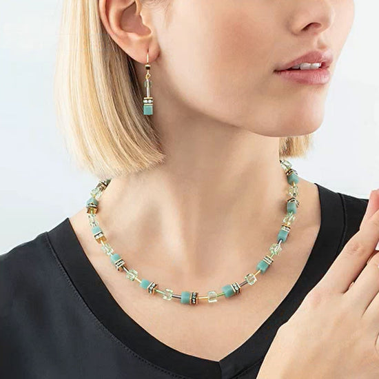 Coeur De Lion GeoCUBE Iconic Mono Gold necklace green 4020/10-0533. Calming green with shimmering gold. This is the GeoCUBE Iconic Mono Gold necklace green. Another model from Coeur De Lion's mono - tone-on-tone line. Stainless steel gold plated. Length: 42 cm + 6 cm extension chain|