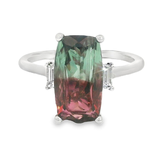 This delicious elongated cushion cut watermelon tourmaline sits in the middle of two white baguette cut diamonds and set into an 18ct white gold claw set mount. Tourmaline: 3.29ct Diamonds: 0.20ct G colour VS clarity.