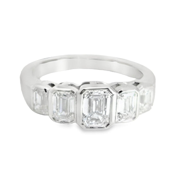 This stunning diamond ring features five contemporary emerald cut diamonds 1.58ct secured in a rub over platinum setting. The Centre Emerald Cut Diamond = 0.60ct D colour VSI clarity, Certificate number 2447541088. The next two diamonds from the centre diamond, are D colour VS clarity and 0.31ct Cert 6412812173 0.30ct Cert 641591523. The 2 Outer Diamonds Are Uncertified. The four outer diamonds = 0.98ct