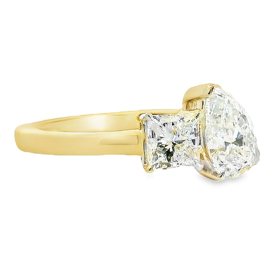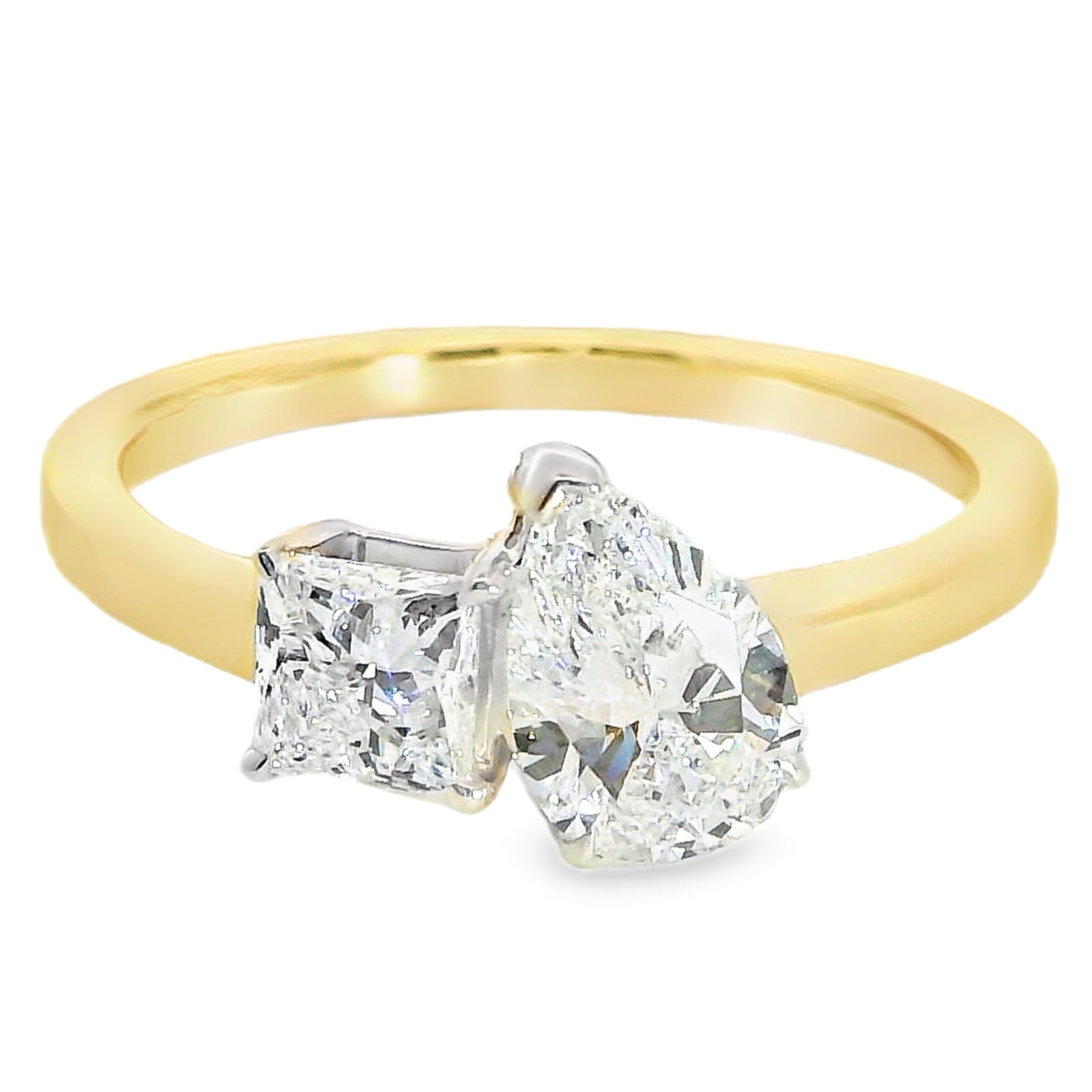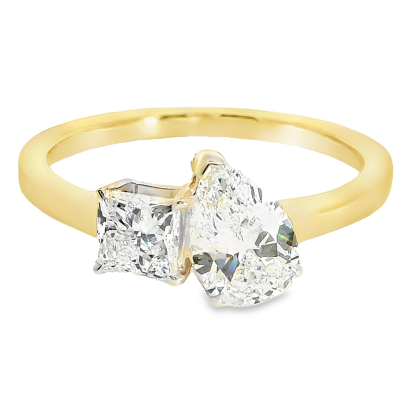 This gorgeous 9ct yellow gold Toi et Moi ring features a 0.75ct D colour VVS2 clarity pear cut laboratory diamond and a 0.45ct D colour VVS2 clarity princess cut laboratory diamond. The setting is 9ct yellow gold, with a 9ct white gold head and secured in a claw setting. Diamond total 1.20ct and all stones are certificated.