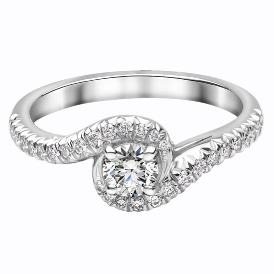 This stunning ring features a round brilliant cut diamond in the centre surrounded by a twisted halo of round white diamonds. The centre diamond is F colour SI clarity.