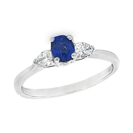 This platinum sapphire and diamond trilogy ring features a central oval sapphire and 2 pear cut diamonds on either side, all in a claw setting, The sapphire is a vivid blue colour and totals 0.53ct. The diamonds are G in colour with vs clarity, totalling 0.28ct.?á