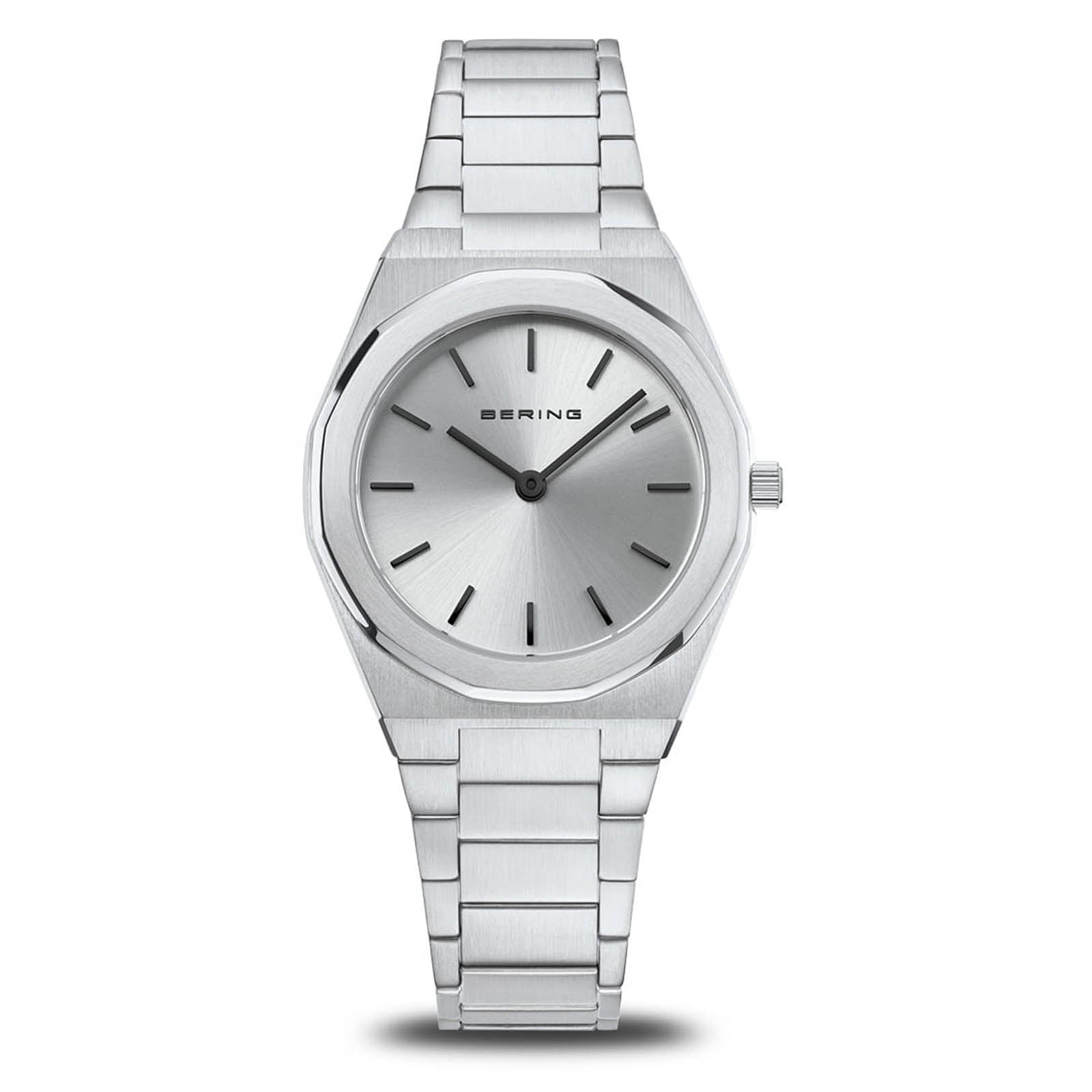 Cool clarity – Scandinavian elegance in silver perfection. This ladies’ watch from the BERING Classic Collection embodies strength and simplicity in design. The 38 mm case in polished and brushed stainless steel makes a bold statement with its oval geometry – modern, minimalist, and timeless. The silver sunray dial captures the light with subtle reflections, adding refined depth. Slim indices and delicate hands ensure clarity and elegance in time display. Flat sapphire crystal protects the surface from scratches and maintains its clean aesthetic. The stainless-steel bracelet, seamlessly integrated into the case, enhances the elegant appearance. A secure folding clasp ensures comfort and stability. With a slim 5 mm case height, the watch wears comfortably light. Inside, a reliable quartz movement ensures precision, while 3 ATM water resistance makes it an everyday companion. A watch for women who embrace clarity and wish to make a strong statement with minimalist elegance. Collection: Sale Product type: watch Gender: female Glass type: flat sapphire crystal Movement type: quartz Case colour: polished/brushed silver Case material: stainless steel Case length: 38mm Case height: 5mm Case width: 32mm Case type: oval Strap colour: silver Strap material: stainless steel strap with stainless steel links Strap length: 155mm Strap width: 19mm Clasp: folding clasp Link material: stainless steel Dial colour: silver Dial Material: sunray Water proofness: 3 ATM