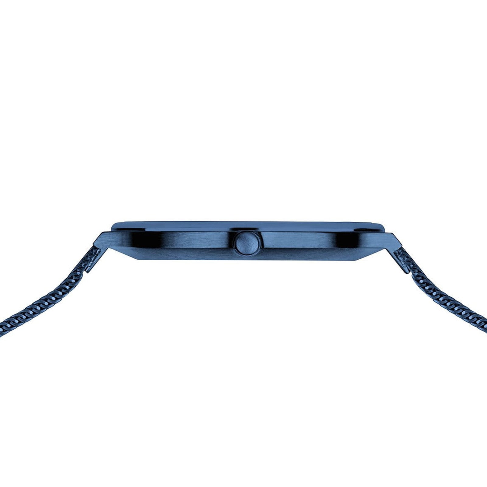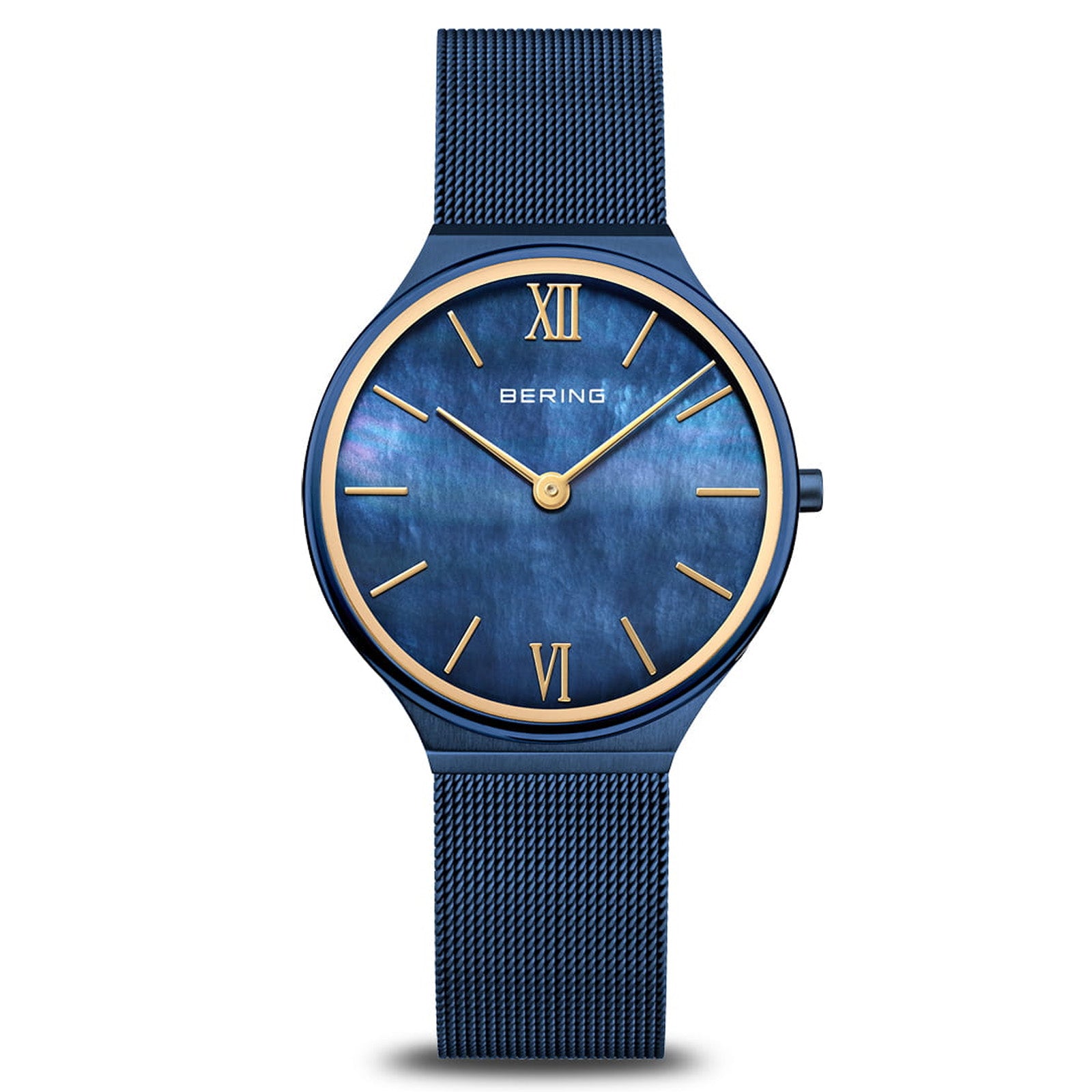 Elegance in deep blue – shimmering like the Northern Lights, clear like BERING’s DNA. This women’s watch from the Ultra Slim collection by BERING is a masterpiece of harmony – between colour and material, clarity and feminine finesse. The slim, oval stainless steel case with IP blue coating is paired with a deep blue genuine mother-of-pearl dial. Depending on the light, iridescent tones dance across the surface – evoking the magic of Arctic skies. Golden indices and Roman numerals at 6 and 12 o’clock add elegant contrast to the dark, luminous dial. The matching blue Milanese strap wraps smoothly around the wrist and fastens securely with a discreet folding clasp. A flat sapphire crystal protects the surface from scratches, while a reliable quartz movement ensures precise timekeeping. With a 34?mm case and 160?mm strap, this model is perfect for women who seek modern elegance with a touch of magic. A watch like Arctic light play – feminine, fascinating, and feather-light. Collection: Ultra Slim Product type: watch Gender: female Glass type: flat sapphire crystal Movement type: quartz Case colour: polished/brushed blue Case material:stainless steel Case length: 40 mm Case height: 5 mm Case width: 34 mm Case diameter: 34 mm Case type: oval Strap colour: blue Strap material: Milanese Strap length: 160 mm Strap width:16 mm Clasp: folding clasp Coating type: ip blue Dial colour: blue Dial Material: mother-of-pearl Water proofness: 3ATM