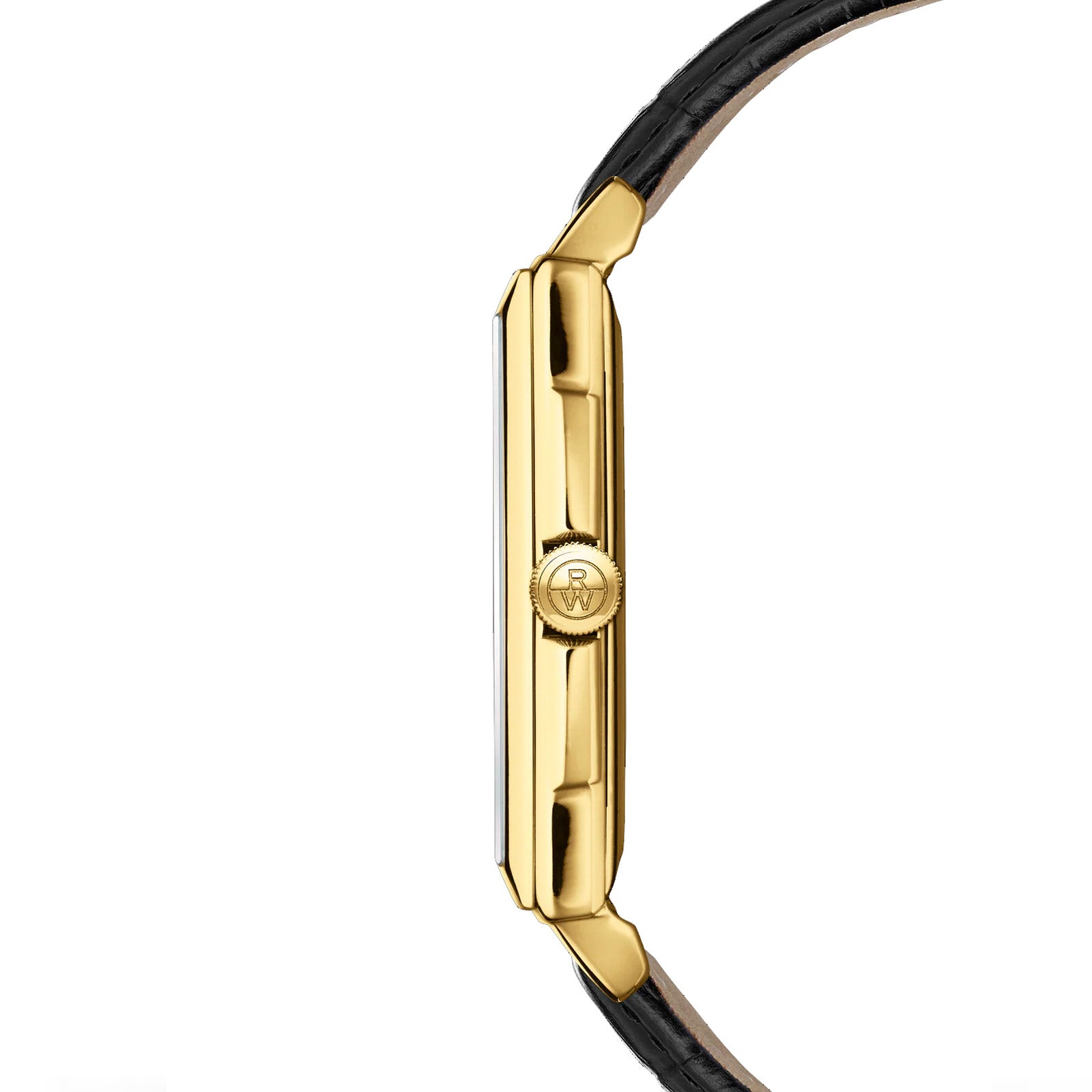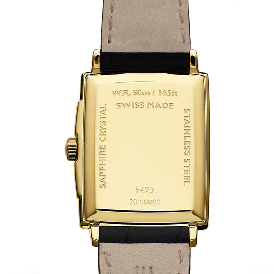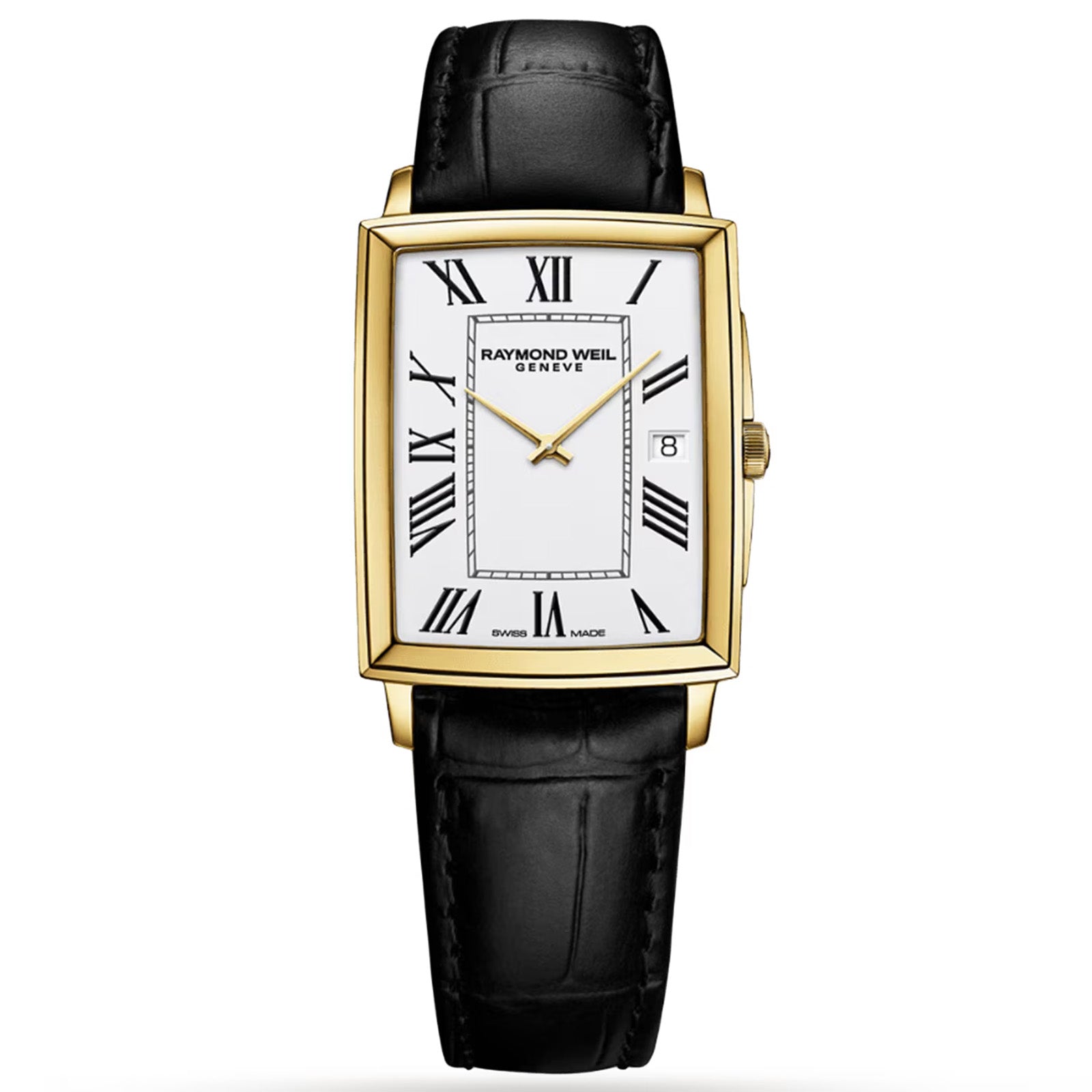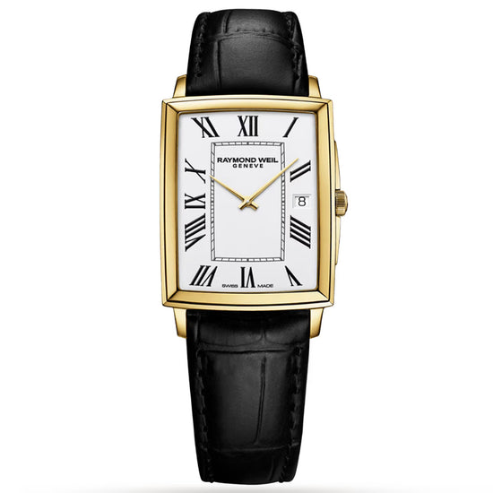 Equipped with a quartz movement, this toccata men’s gold-plated wristwatch features a sleek stainless steel rectangular case with a date window at 3 o’clock, a sophisticated white dial punctuated with black Roman numeral markers, and complemented by a black genuine calf leather strap to add a touch of warmth to this modern classic. Refined design and timeless materials: toccata will impress men on whom time holds no dominion. This elegant and timeless collection celebrates the artistic and musical spirit behind the Brand’s DNA. Following in the footsteps of the great composers, toccata promotes RAYMOND WEIL’s Swiss horology while respecting the tradition and heritage handed down from generation to generation within the family company. Technical datas Collection: toccata Size: Gents Shape: Rectangular Movement: Quartz Movement Caliber Height: 2.5 mm Case Material: Stainless steel with yellow gold PVD plating Case size: 37 mm x 29 mm Case Thickness: 6.4 mm Case Back: Snapped Water Resistance: 50 m, 165 ft, 5atm Crystal: Sapphire Dial: White, with Roman numerals Crown: with RW logo Clasp: Stainless steel traditional buckle with yellow gold PVD plating Bracelet Genuine calf leather strap