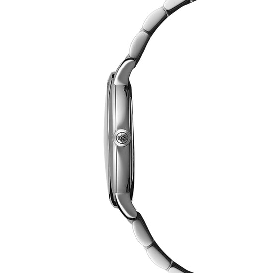 Simplicity is of the essence with this toccata men's classic white dial quartz watch that offers a clean 39mm stainless steel case and a discreet date window is situated at 3 oclock. Refined design and timeless materials: toccata will impress men on whom time holds no dominion. This elegant and timeless collection celebrates the artistic and musical spirit behind the Brand’s DNA. Following in the footsteps of the great composers, toccata promotes RAYMOND WEIL’s Swiss horology while respecting the tradition and heritage handed down from generation to generation within the family company. Technical datas Collection: toccata Size: gents Shape: round Movement: quartz Movement Caliber Height: 2.5 mm Case Material: stainless steel Case size: 39 mm Case Thickness: 7.89 mm Case Back: snapped Water Resistance: 50 m, 165 ft, 5atm Crystal: sapphire Dial: white, with indexes Crown: with RW logo Clasp: stainless steel folding clasp with double push-security system Bracelet stainless steel