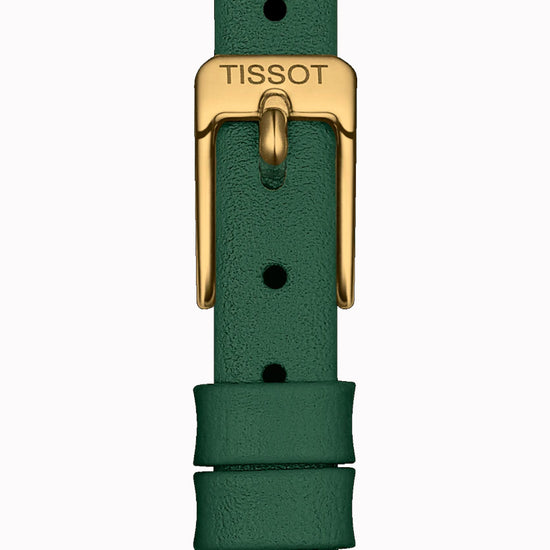 Tissot Lovely T140.009.36.091.00. Round green dial with baton markers. Gold plated stainless steel 19.5mm case on green leather strap. Domed faceted sapphire crystal glass. 30m water resistant. This stunning piece conveys the very essence of class with its discrete yet absolutely gorgeous mini-size and feminine round case. These watches carry their name well as they are truly lovely timepieces with completely irresistible charm. For a stylish touch, choose a bold colour on the dial or on the strap. Discover this lovely version with its facetted sapphire glass, its deep green dial and matching leather strap, for a chic and elevated look. Movement - Swiss quartz.