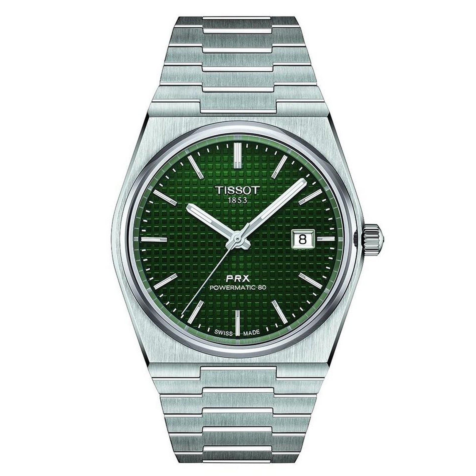 Tissot PRX Powermatic 80 T137.407.11.091.00. Round dark green textured dial with baton markers and date. 40mm stainless steel case and bracelet. Sapphire crystal glass and 100m water resistant. The self-winding Powermatic 80 movement delivers reliability and precision thanks to the innovative Nivachron hairspring. With 80 hours of power reserve, it's a modern movement designed to keep pace with busy lifestyles.|