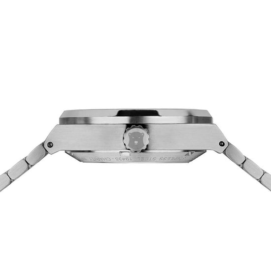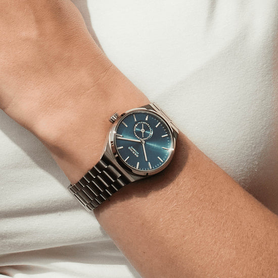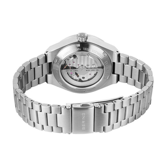 Crafted from stainless steel with link bracelets, the BERING ladies watch embodies the brand's signature cool and minimalist style. Every detail of this design piece reflects the innovation and timeless design that BERING is known for. The iconic Arctic Blue sunray dial is adorned with luminous white and silver-coloured indices and hands that ensure optimal legibility. A white tip on the second hand adds a touch of contrast and reflects the pristine beauty of the Arctic. The transparent case back, a trademark of BERING automatic watches, allows a glimpse of the high-quality movement and combines aesthetic sophistication with purposeful design. This watch collection showcases our commitment to innovation and high-quality craftsmanship. Collection: Sale Product type: watch Gender: female Glass type: flat sapphire crystal Movement type: automatic Case colour: brushed silver Case material: stainless steel Case length: 40mm Case height: 12mm Case width: 35mm Case type: oval Strap colour: silver Strap material: stainless steel strap with stainless steel links Strap length: 145mm Strap width: 11mm Clasp: folding clasp Link material: stainless steel Dial colour: blue Dial Material: sunray Water proofness: 10 ATM