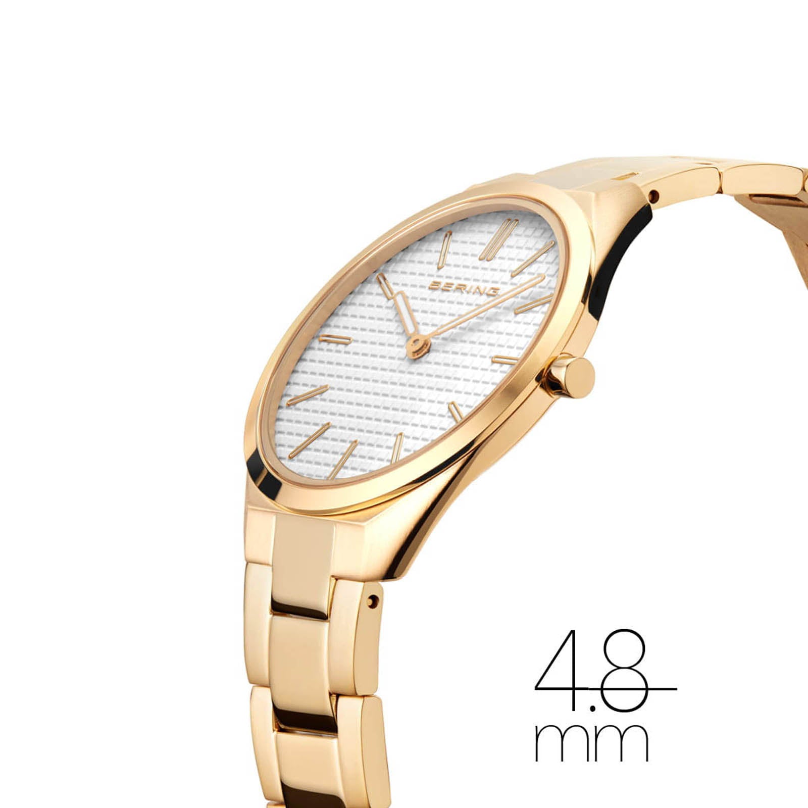 Timeless elegance in gold – inspired by the serene clarity of the Arctic. This BERING women’s watch combines minimalist design with luxurious shine. The oval, ultra-slim 5mm case made of polished and brushed stainless steel glows in a warm golden tone a tribute to the setting sun over frozen landscapes. The finely textured white dial evokes delicate snow crystals and is accented by slim hour markers and simple hands. Subtle, yet striking. A flat sapphire crystal protects the refined dial structure from scratches and enhances the clean lines of the design. The golden stainless steel bracelet, with its elegant central links, sits comfortably on the wrist and fastens securely with a folding clasp – ideal for both everyday wear and special occasions. Driven by a precise quartz movement, this watch offers style and reliability in one. With a 31mm case diameter and a 166mm bracelet length, it's the perfect choice for slender wrists. Minimalism meets refinement – this watch is more than an accessory: it's a quiet statement of style. Collection: Sale Product type: watch Gender: female Glass type: flat sapphire crystal Movement type: quartz Case colour: polished/brushed gold Case material: stainless steel Case length: 37mm Case height: 5mm Case width: 31mm Case diameter: 31mm Case type: oval Strap colour: gold Strap material: stainless steel strap with stainless steel links Strap length: 166mm Strap width: 14 mm Clasp: folding clasp Link material: stainless steel Dial colour: white Water proofness: 3 ATM