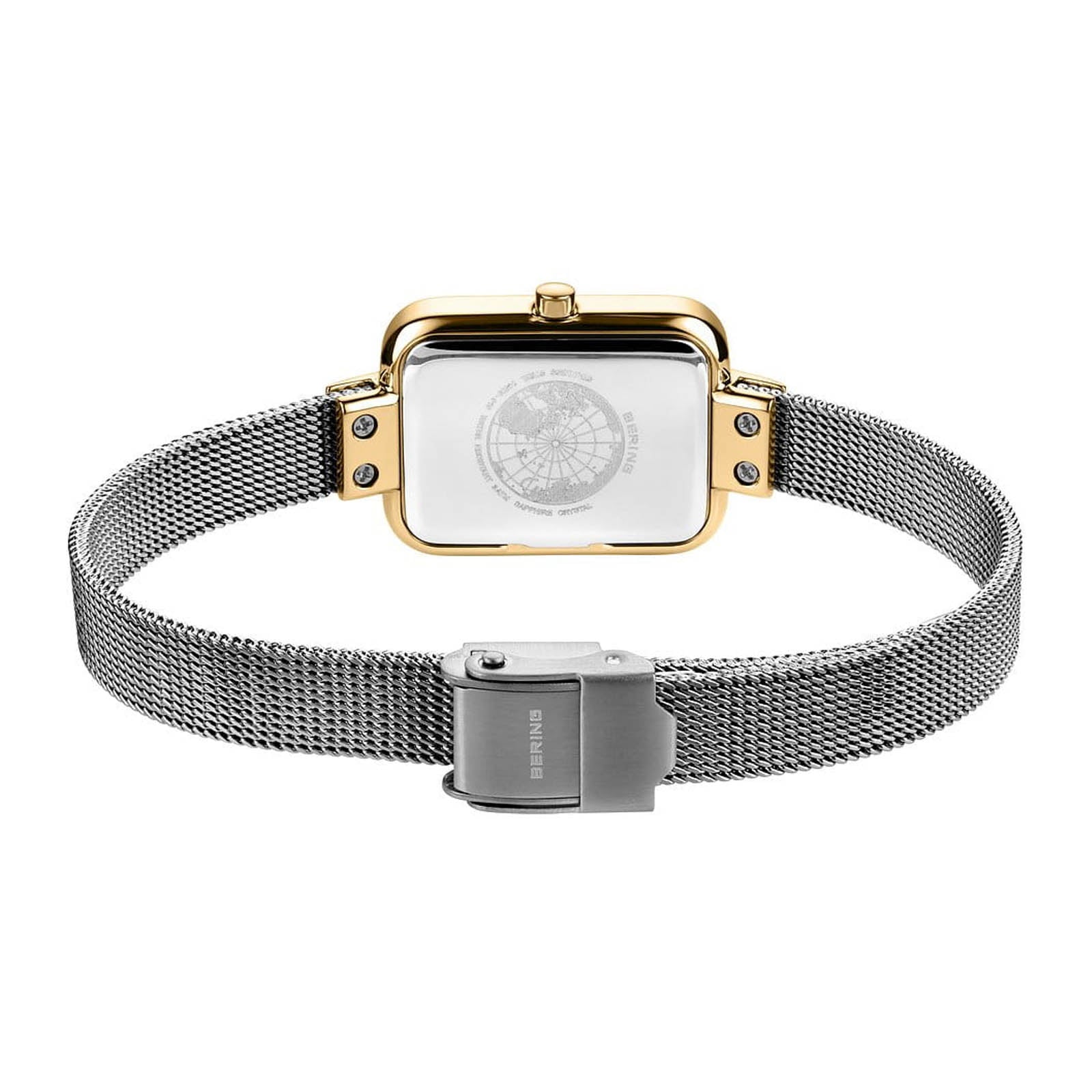 This women’s model from the BERING Classic Collection embodies the essence of Scandinavian design: minimalist, clear, and elegant. The silver-coloured dial is deliberately understated, with fine gold-coloured hands that emphasise its restraint while lending the piece a touch of feminine warmth. The rectangular stainless steel case (20 x 35 mm) in polished and brushed gold tones creates a refined frame for the modern design and flows seamlessly into the finely woven silver Milanese strap. Its delicate structure rests smoothly on the wrist and is secured with a practical fold-over clasp – both comfortable and stylish. A flat sapphire crystal reliably protects the dial from scratches, while the precise quartz movement inside ensures accurate timekeeping. With a water resistance of 3 ATM, this model is an elegant companion for everyday wear and special occasions alike. Collection: Classic Product type: watch Gender: female Glass type: flat sapphire crystal Movement type: quartz Case colour: polished/brushed gold Case material: stainless steel Case length: 35mm Case height: 6mm Case width:  20mm Case type: angular Strap colour: silver Strap material: Milanese Strap length: 175mm Strap width: 8mm Clasp: safety clasp Dial colour: silver Water proofness: 3 ATM