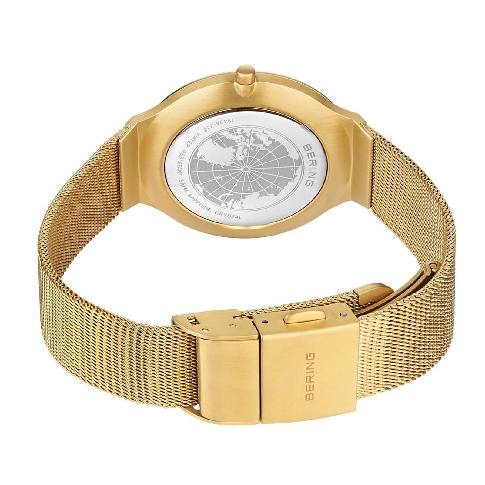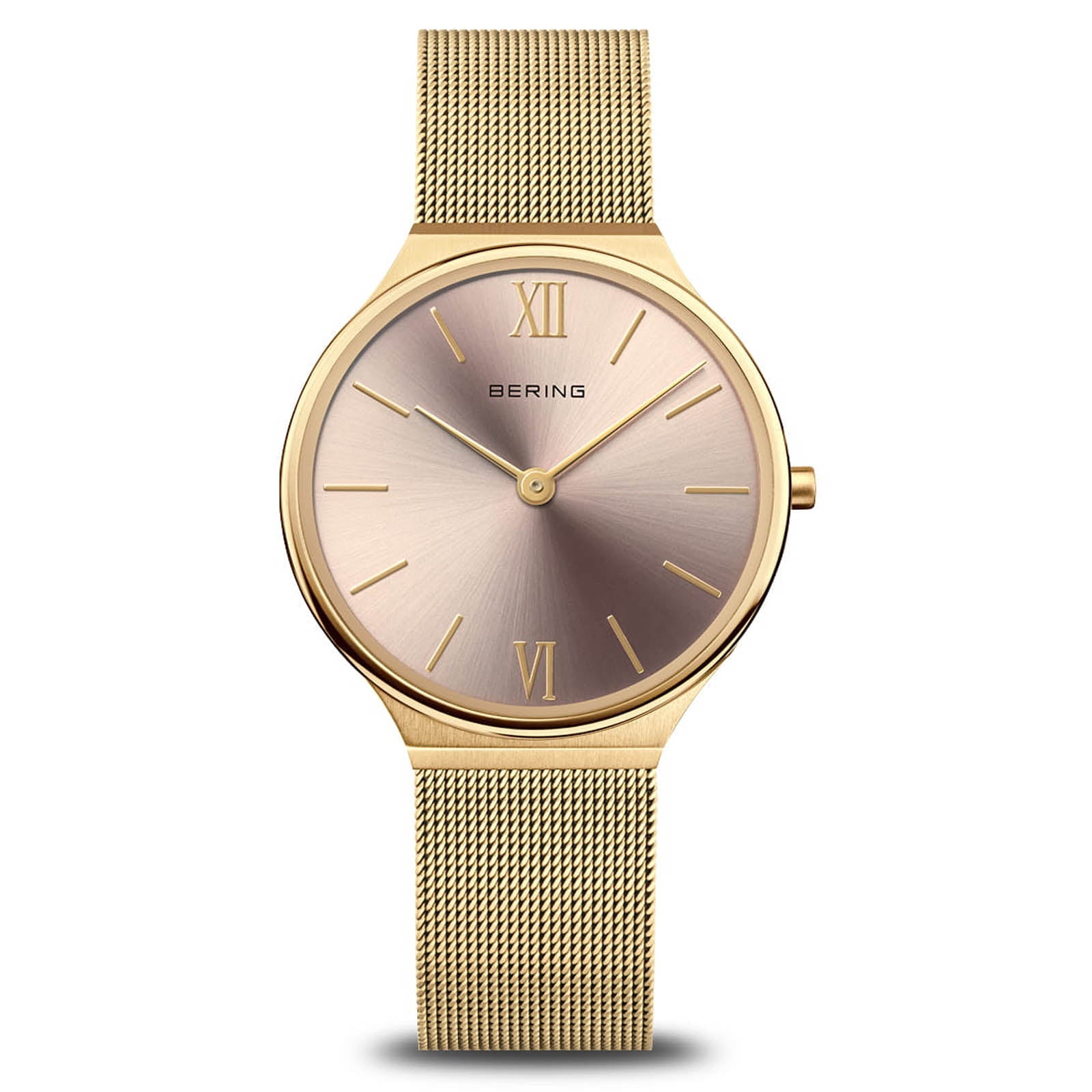 Soft rose tones in golden shine – timeless lightness with feminine elegance. This watch from BERING’s Ultra Slim collection combines refined minimalism with a touch of luxury. The oval stainless-steel case, polished and brushed in gold, is just 5mm high and sits gracefully flat on the wrist. The rose gold sunray dial captures the light with soft, warm reflections, giving the watch a modern yet delicate appearance. Fine indices and Roman numerals at 6 and 12 o’clock add subtle definition to the monochrome design. The matching gold Milanese strap flows smoothly from the case and fastens securely with a folding clasp. A flat sapphire crystal protects the surface from scratches, while a precise quartz movement ensures accurate timekeeping. With a 34mm case and a 160mm strap, this watch is ideal for women who seek subtle elegance in its most graceful form. A watch like sunlight on the skin – golden, light, and effortlessly elegant. Collection: Ultra Slim Product type: watch Gender: female Glass type: flat sapphire crystal Movement type: quartz Case colour: polished/brushed gold Case material: stainless steel Case length: 38mm Case height: 5mm Case width: 34mm Case diameter: 34mm Case type: oval Strap colour: gold Strap material: Milanese Strap length: 160mm Strap width: 16mm Clasp: folding clasp Dial colour: rose gold Dial Material: sunray Water proofness: 3ATM