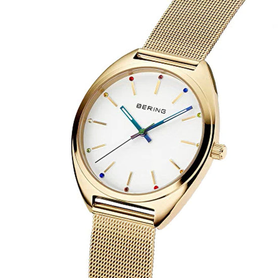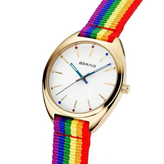 Bering Classic Freedom 127220-36-334. The BERING FREEDOM collection combines the timeless elegance of Danish design with a powerful message of solidarity. The robust 36mm gold plated stainless steel case, inspired by the clear beauty of the Arctic, is water-resistant up to 5 ATM and provides reliable protection in everyday life. The stylish matching Milanese band perfectly harmonises with the interchangeable NATO strap in vibrant rainbow colours, symbolising diversity and inclusion. The watch features fluorescent hands and colourful indices that reflect the colours of the rainbow, creating a harmonious appearance. The back of the watch bears the engraving 'Supporting LGBT+ Danmark,' highlighting the commitment to this important organisation.