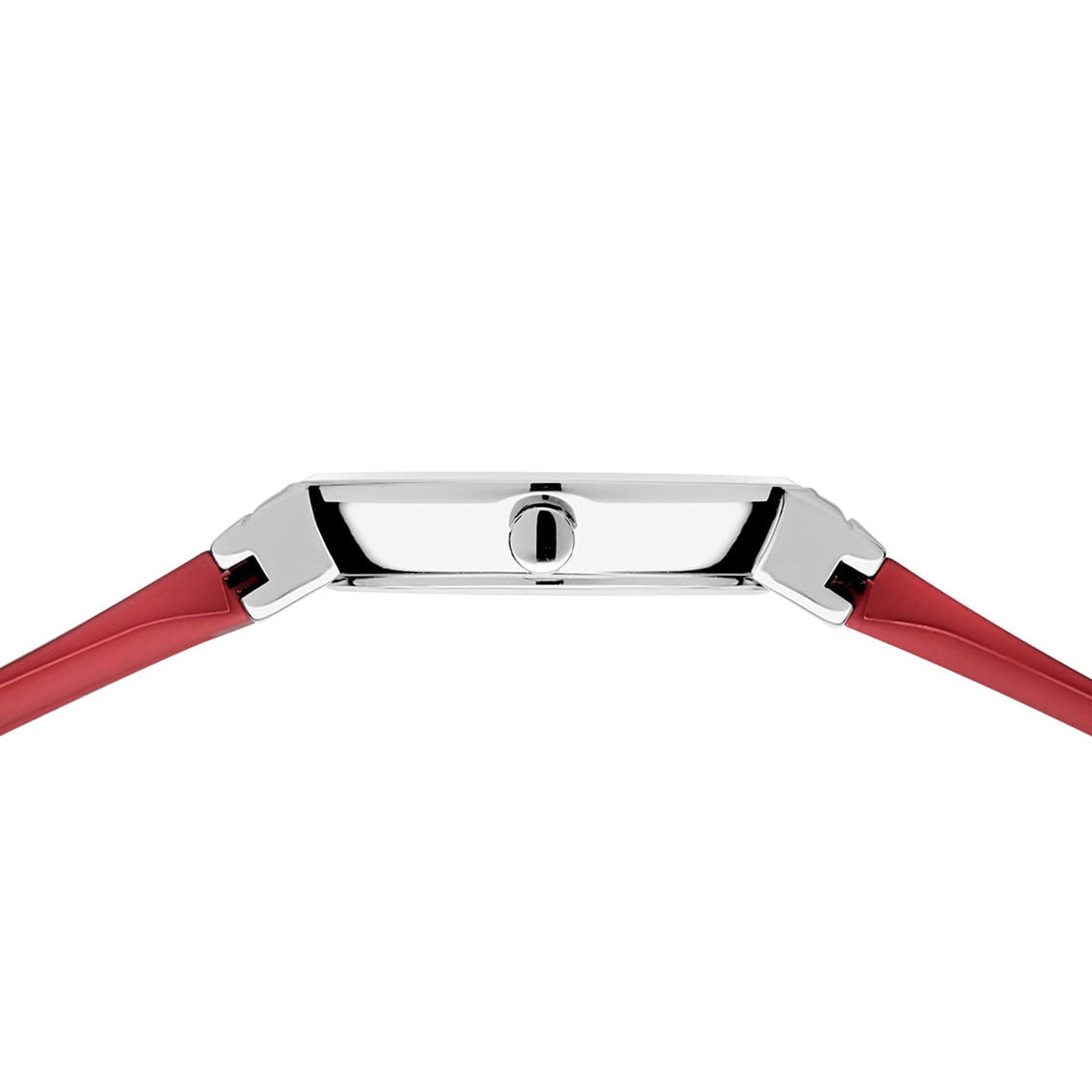 The 29 mm polished stainless steel case in silver flows harmoniously into the red silicone strap, which is soft, flexible, and especially comfortable to wear. Secured with a classic pin buckle, the watch sits safely and elegantly on the wrist. A flat sapphire crystal provides lasting protection against scratches, while the precise quartz movement ensures accurate timekeeping. With water resistance up to 3 ATM, this model is a charismatic companion that masterfully combines vibrant colour with Nordic simplicity. Collection: Classic Product type: watch Gender: female Glass type: flat sapphire crystal Movement type: quartz Case colour: polished silver Case material: stainless steel Case length: 35mm Case height: 6mm Case width: 29mm Case diameter: 29mm Case type: round Strap colour: red Strap material: silicone Strap length: 175mm Strap width: 14mm Clasp: pin buckle Dial colour: red Dial Material: sunray Water proofness: 3ATM