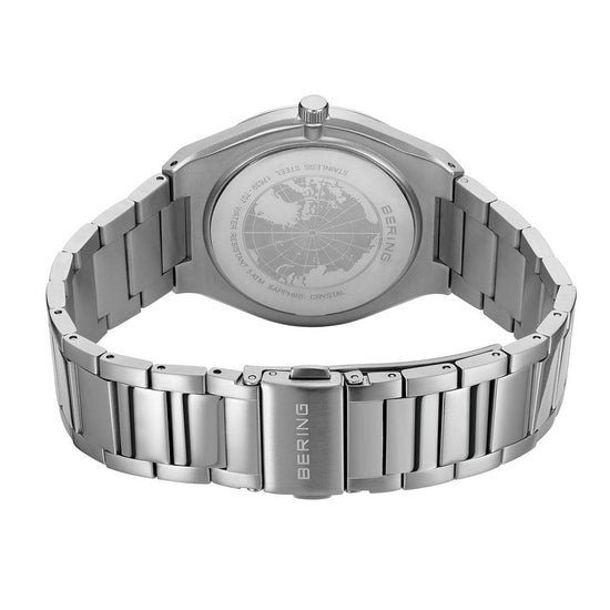 Classic, pure, yet exciting. Perfect style combined with contemporary minimalism. Inspired by Danish design, the CLASSIC COLLECTION represents a unique timepiece, perfectly highlights your daily style. The cool look of the stainless steel and the puristic and clear line of the BERING watch design complement each other ideally and guarantee a glittering appearance. The elegant BERING look is achieved with a finely brushed or highly polished stainless-steel surface. Collection: Classic Product type: watch Gender: male Glass type: flat sapphire crystal Movement type: quartz Case colour: polished silver Case material: stainless steel Case length: 45mm Case height: 6mm Case width: 39mm Case type: round Strap colour: silver Strap material: stainless steel strap with stainless steel links Strap length: 166mm Strap width:18mm Clasp: folding clasp Link material: stainless steel Dial colour: blue Dial Material: sunray Water proofness: 5 ATM