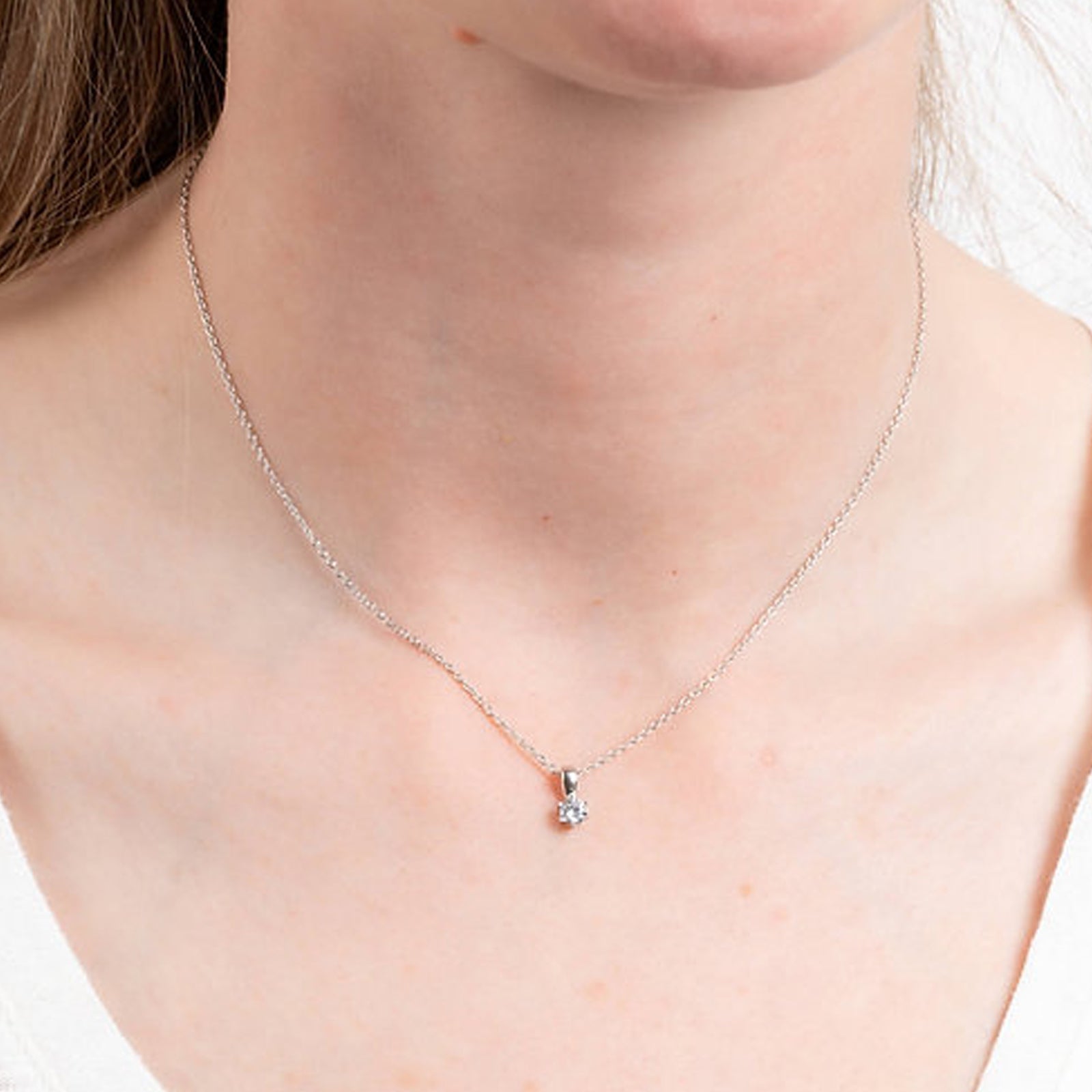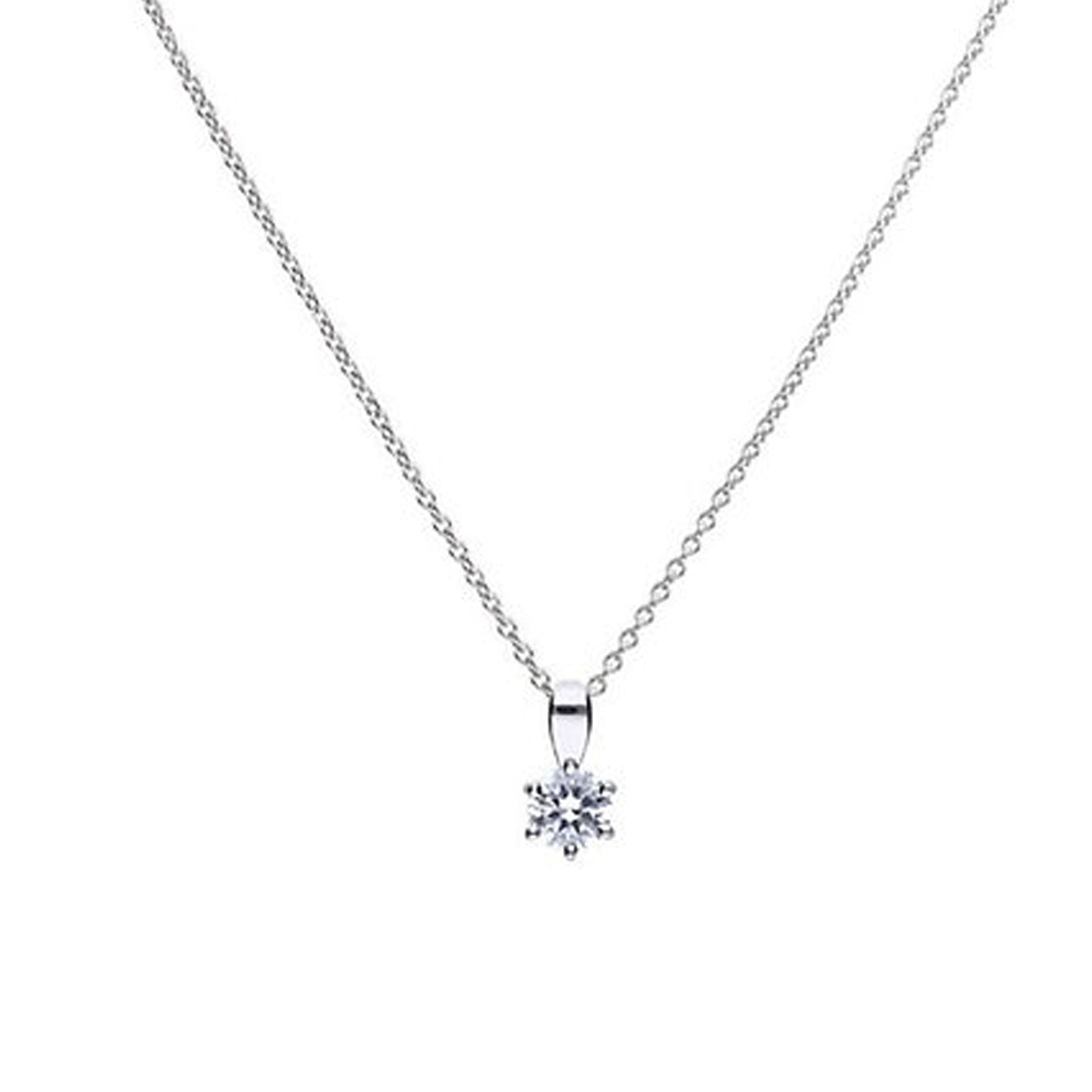 This simple claw set 0.25ct zirconia solitaire necklace is a classic style that makes the perfect addition to any jewellery box. Featuring Diamonfire cubic zirconia stones which are each cut and polished to mirror the brilliance of a genuine diamond. The product also is made from sterling silver with a triple plated finish of palladium, platinum and rhodium for an almost life-long tarnish protection. Composition: This necklace is made from sterling silver with a finish of palladium, platinum and rhodium. Stones are Diamonfire cubic zirconia. Dimensions: Item weight 2.39g, height 9.5mm, width 4.4mm, depth 3.2mm Fitting: This necklace is extendable with a length of 42cm-48cm. Features a secure lobster style clasp.
