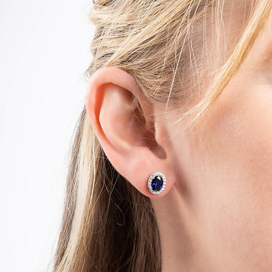 Add a royal sparkle to your outfit with these spectacular oval stud earrings, featuring a sapphire blue Diamonfire zirconia central stone and pave clear Diamonfire zirconia surround (1.86ct total). These majestic earrings will look impressive on their own but why not wear with the matching necklace and ring to complete the look! Diamonfire cubic zirconia stones are each cut and polished to mirror the brilliance of a genuine diamond. Each piece in the collection is crafted in sterling silver with a triple plated finish of palladium, platinum and rhodium, for an almost life-long tarnish protection. All purchases from the Diamonfire collection come with beautiful packaging including a jewellery box, branded gift bag and branded ribbon. Composition: These earrings are made from sterling silver with a triple plated finish of palladium, platinum and rhodium. Stones are Diamonfire cubic zirconia. Total carat weight: 1.86ct Fitting: These earrings feature a secure post and butterfly style fastening