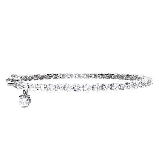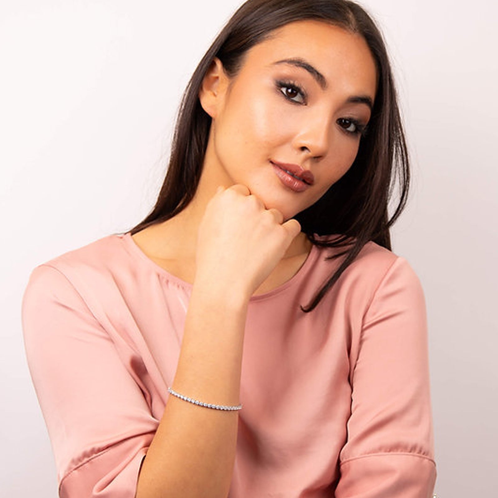 This dazzling small zirconia charm tennis bracelet is a beautiful way to add that extra sparkle to any outfit. Featuring Diamonfire cubic zirconia stones which are each cut and polished to mirror the brilliance of a genuine diamond. The product also is made from sterling silver with a triple plated finish of palladium, platinum and rhodium for an almost life-long tarnish protection. Now also available in 24ct yellow gold plated sterling silver! Fitting: This bracelet has an extendable length of 17cm-19cm. Composition: crafted from sterling silver with a plated finish of either 24ct yellow gold or palladium, platinum & rhodium. Stone weight: 4.55ct  Dimensions (HxD): 3.00 x 3.00 mm.