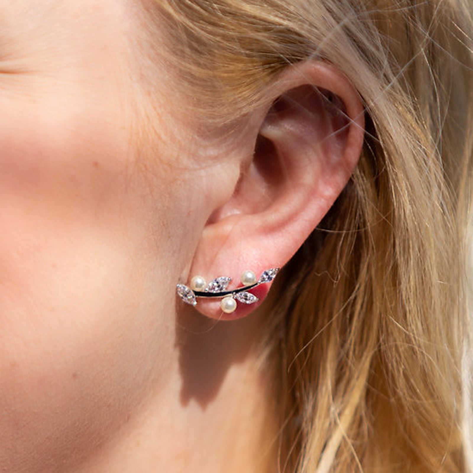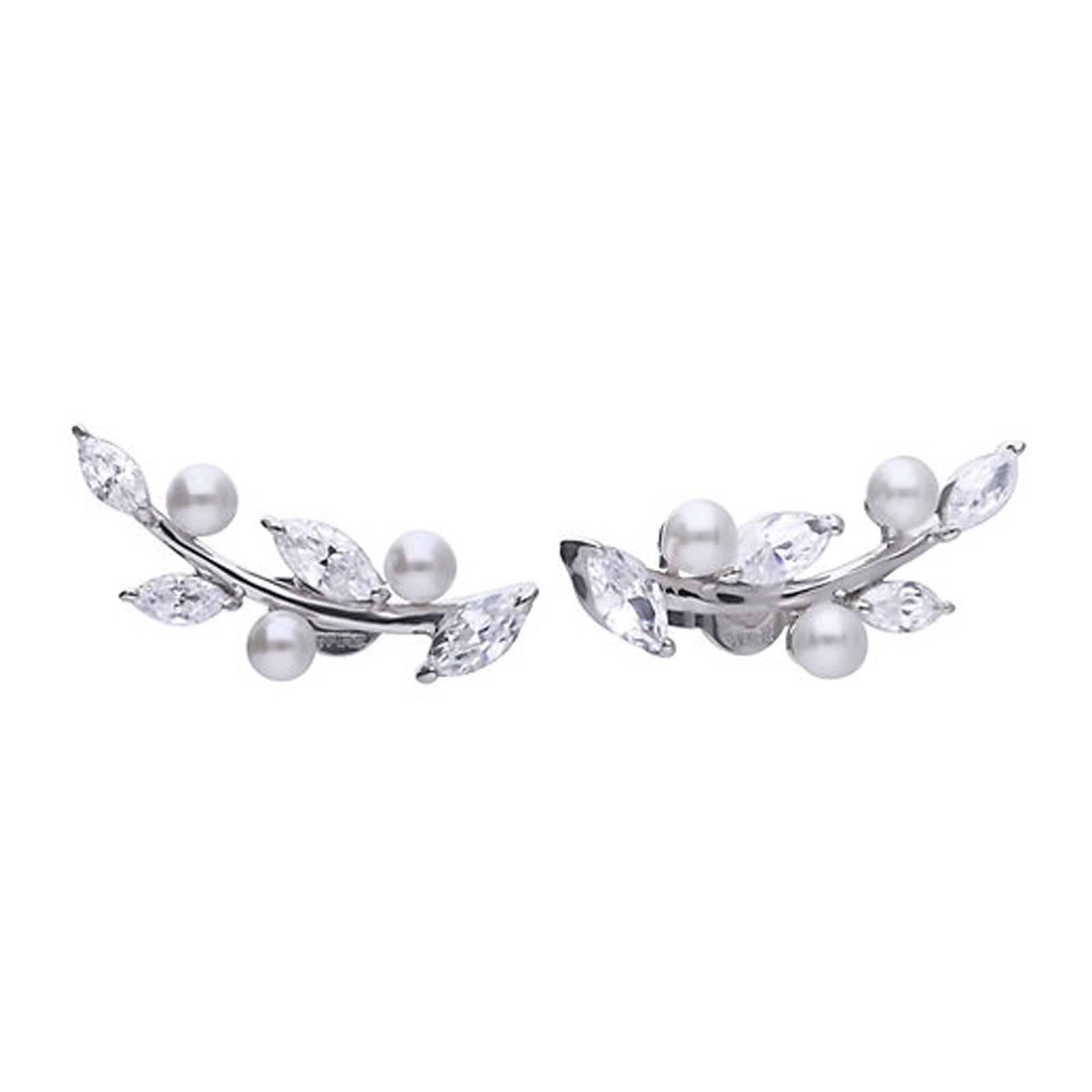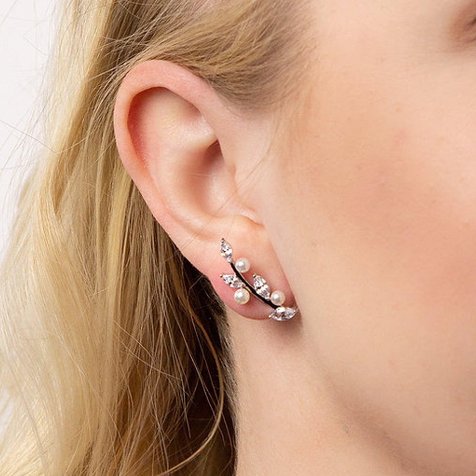 These statement pearl and zirconia crawler earrings are perfect for adding an extra sparkle to your outfit. Featuring Diamonfire cubic zirconia stones which are each cut and polished to mirror the brilliance of a genuine diamond. The product also is made from sterling silver with a triple plated finish of palladium, platinum and rhodium for an almost life-long tarnish protection. Composition: These earrings are made from sterling silver with a triple plated finish of palladium, platinum and rhodium. All stones are Diamonfire cubic zirconia and shell pearl Dimensions: Height 8mm, Width 22.2mm. Pearl stones 3.5mm, zirconia stones 6mm x 3mm and 5mm x 2.5mm Total Stone Weight: 1.6ct