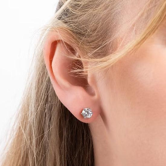 These simple claw set 2ct zirconia solitaire earrings are a classic style that makes the perfect addition to any jewellery box. Featuring Diamonfire cubic zirconia stones which are each cut and polished to mirror the brilliance of a genuine diamond. The product also is made from sterling silver with a triple plated finish of palladium, platinum and rhodium for an almost life-long tarnish protection. Composition: These earrings are made from sterling silver with a triple plated finish of palladium, platinum and rhodium finish. Stones are Diamonfire cubic zirconia. Dimensions: Item weight 1.49g, height 6.8mm, width 6.8mm, depth 4.7mm Fitting: These earrings feature a secure post and butterfly style fitting.